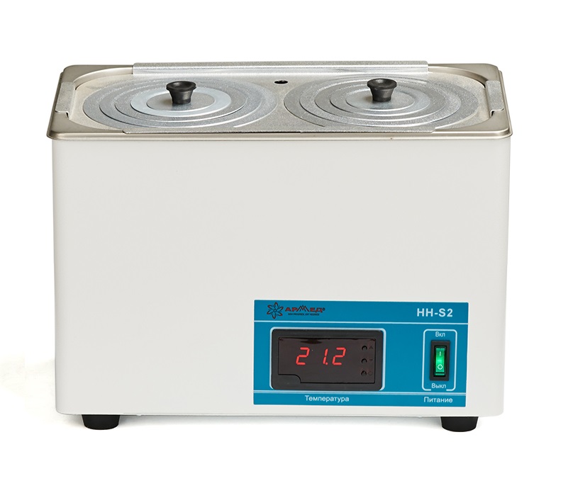 - Армед HH-S2: Эта версия водяной бани оснащена двумя секциями для установки емкостей разного диаметра, что является оптимальным решением для лабораторий с умеренными требованиями к количеству одновременно обрабатываемых образцов.