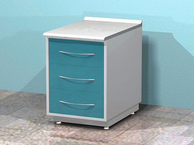 Габаритные размеры тумбы (ШхГхВ): 465х480х600 мм — оптимальны для интеграции в различные планировки кабинетов, не занимая при этом много места. Доступна в различных цветовых решениях, что позволяет гармонично вписать её в интерьер медицинского учреждения.
