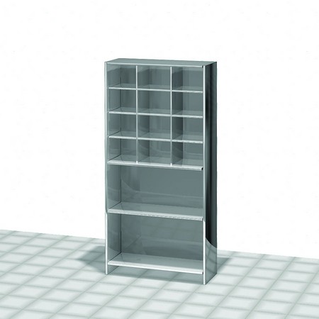 Верхняя секция шкафа оборудована удобными нишами-ячейками (12 штук), идеально подходящими для систематизированного хранения мелких инструментов, расходных материалов или медикаментов, требующих быстрого доступа. Нижняя секция предлагает два просторных отделения, что позволяет эффективно организовать хранение более крупного оборудования или запасов.