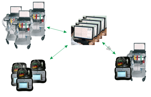 - Стационарные и передвижные компьютерные электрокардиографы: запись ЭКГ в кабинете и палатах с передачей данных по компьютерной сети или интернету.