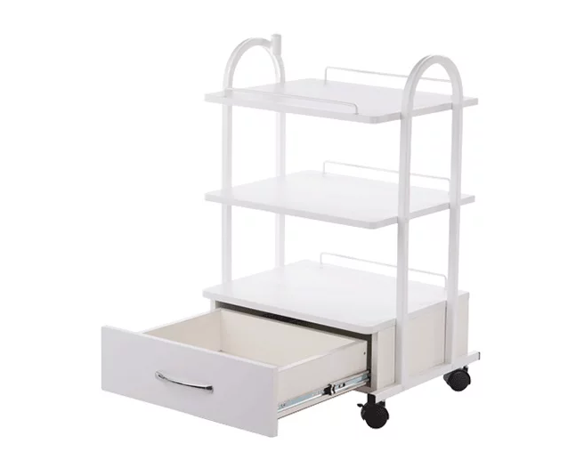 Влагостойкие полки из МДФ: Материал полок обладает высокой устойчивостью к влаге и агрессивным дезинфицирующим средствам, что значительно упрощает процесс стерилизации и ухода, продлевая срок службы столика.