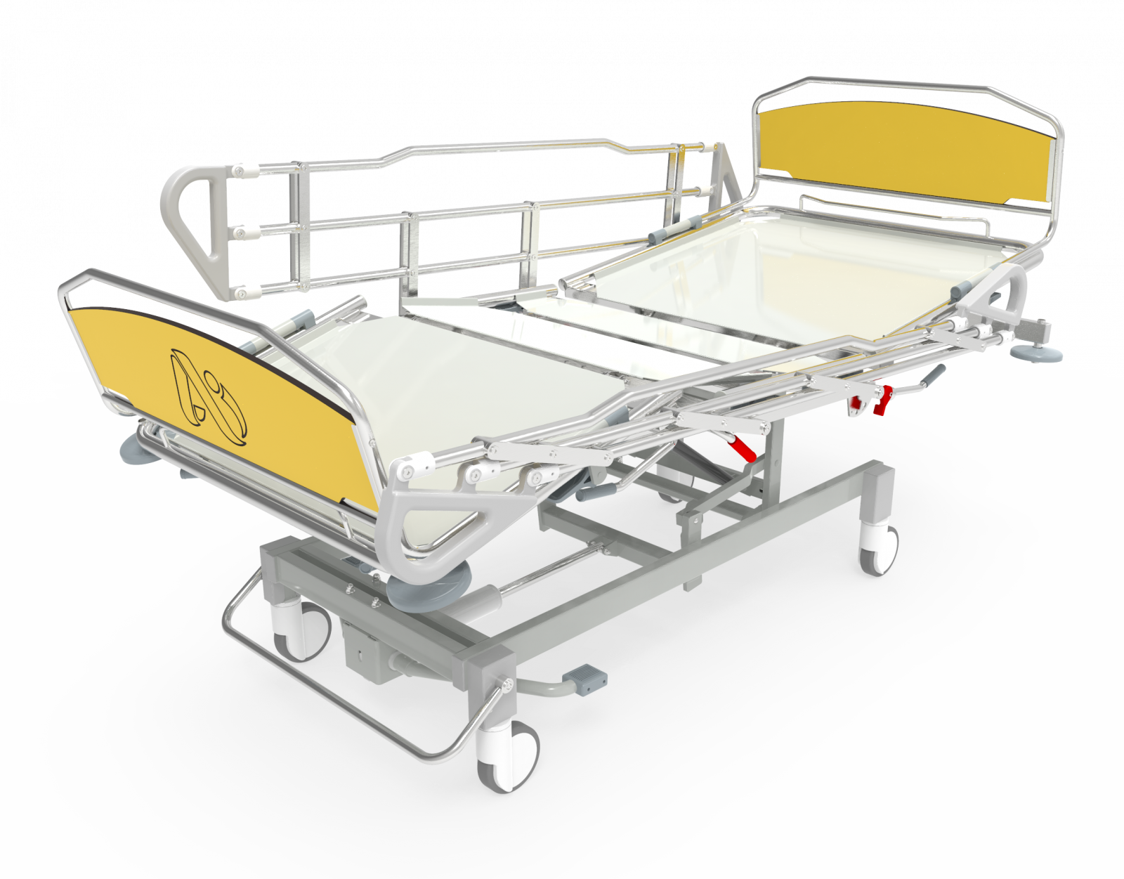 - Хромированные складывающиеся боковые ограждения, обеспечивающие безопасность пациента.