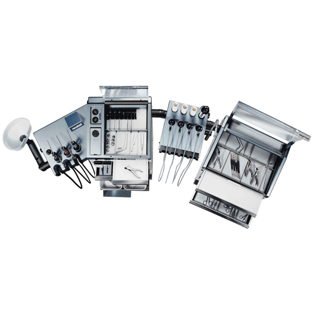 - Эргономичная двухуровневая инструментальная стойка, включающая алюминиевые поддоны, хромированные разделители и прозрачную крышку из плексигласа.