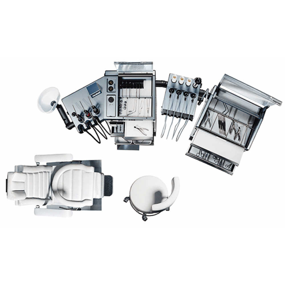 Верхняя панель установки представляет собой просторную инструментальную поверхность, предназначенную для удобного размещения всего необходимого инструментария. Дополнительно ЛОР-комбайн оборудован лотком для использованных инструментов, полным комплектом для инсталляции и прочной фиксированной подставкой для размещения дополнительного оборудования. Особое внимание уделено наличию специализированного эндоскопического центра, расширяющего диагностические возможности врача.