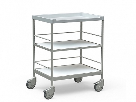 Полки столика выполнены из компакт-ламината и оснащены высоким ограждением с трех сторон, надежно предотвращая падение предметов. Для удобства перемещения столик установлен на большие колеса диаметром 125 мм, два из которых оборудованы надежными тормозами для фиксации в нужном положении.