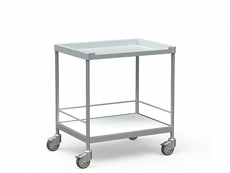 Столик доступен в следующем исполнении: медицинский процедурный стол на колесах с двумя полками, каркас из профильной трубы с порошковой окраской, верхняя полка из ABS-пластика, нижняя из HPL. Колеса диаметром 100 мм, два из них с тормозами. Размеры столика: 755*565*815 мм.