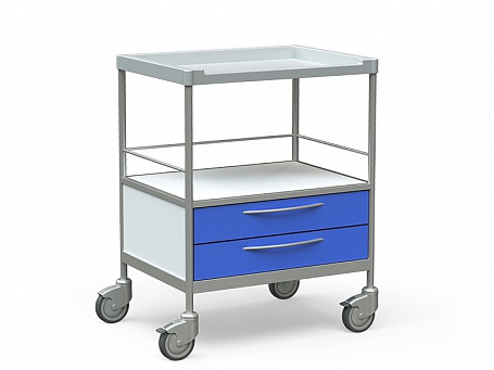 Нижняя полка столика, выполненная из компактного ламината, оснащена высокими бортиками с трех сторон, что предотвращает падение размещенных на ней предметов. Столик установлен на надежные колеса диаметром 125 мм, два из которых снабжены тормозами для фиксации положения.