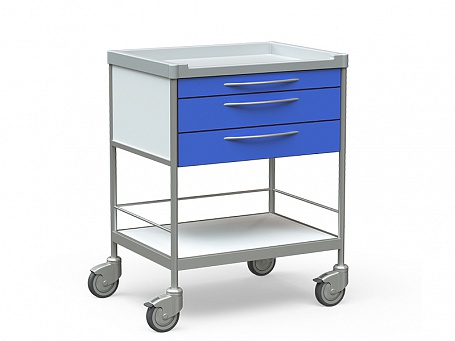 Модель поставляется в следующем исполнении: медицинский процедурный столик на колесах с двумя полками и тремя выдвижными ящиками. Каркас выполнен из профильной трубы с порошковой окраской. Верхняя полка — ABS-пластик, нижняя — HPL, фасады — HPL, съемные ящики — ABS-пластик стандарта ISO (1 штука – 400×600×50 мм, 2 штуки – 400×600×100 мм). Направляющие с плавной доводкой при закрывании. Колеса 125 мм, два из них с тормозами.
