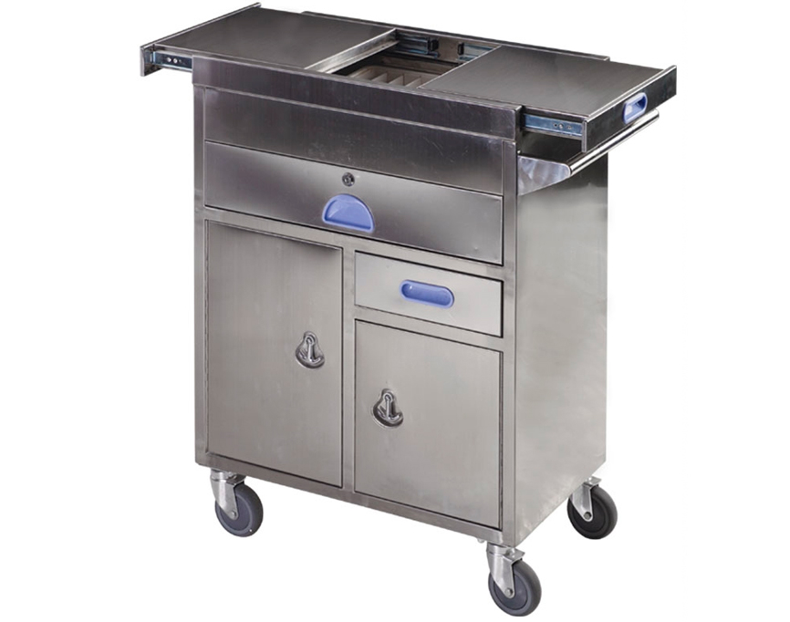 Стандартные размеры тележки составляют (Д)670 х (Ш)410 х (В)900 мм, что делает ее компактной, но при этом достаточно вместительной для размещения всего необходимого оборудования и расходных материалов в условиях ограниченного пространства.