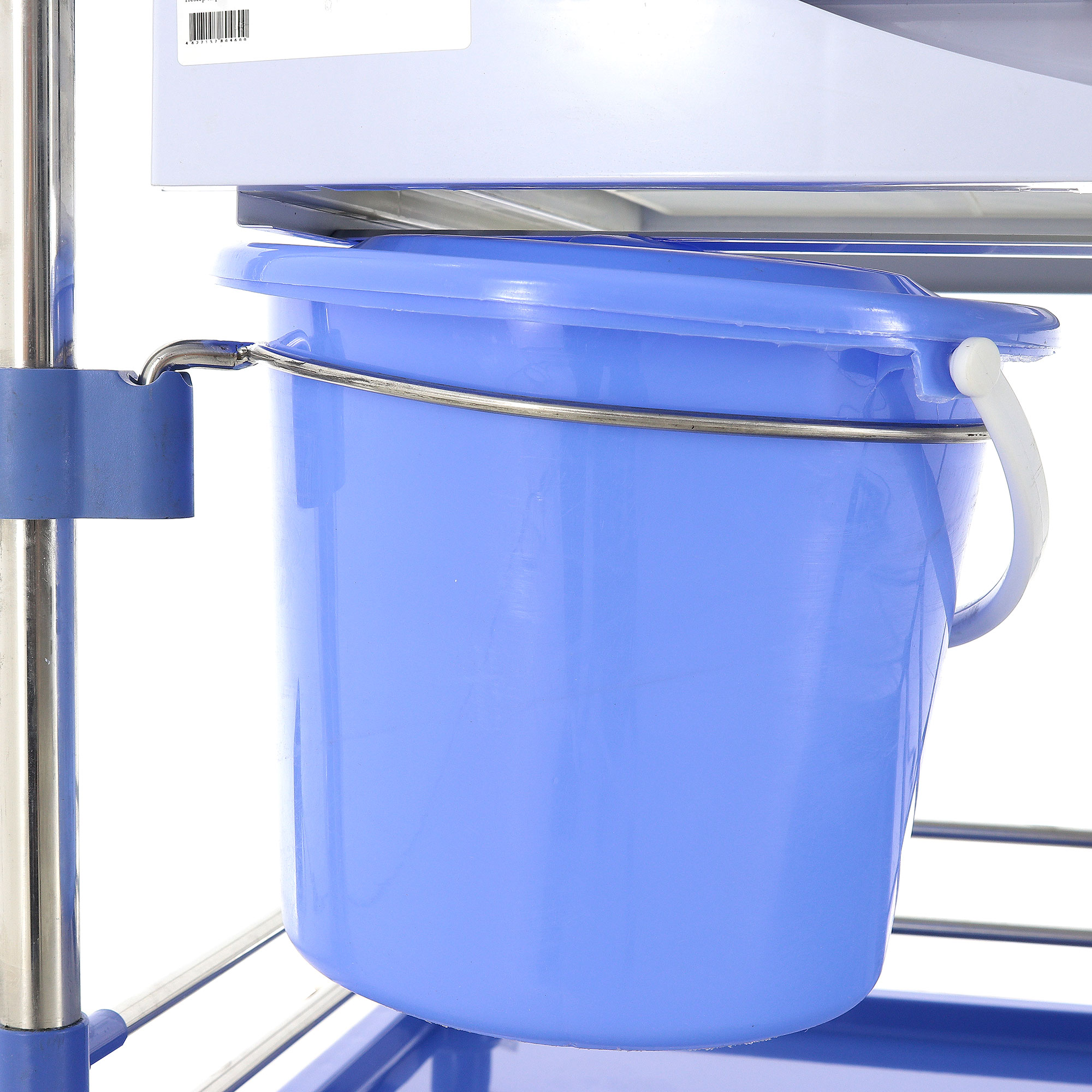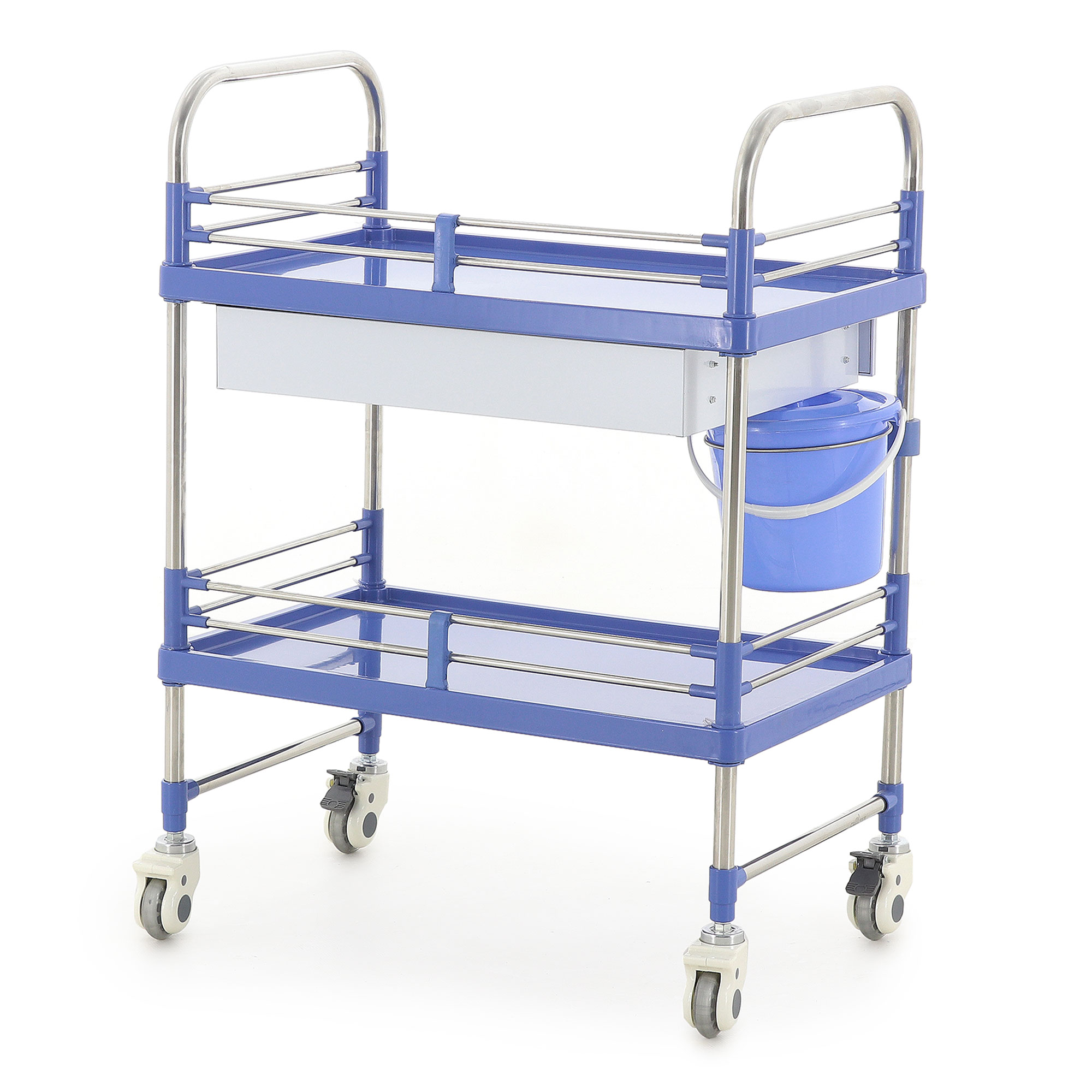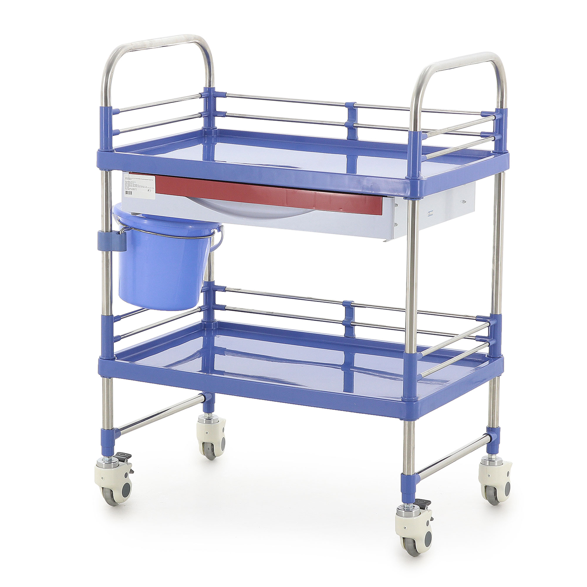 Конструкция тележки состоит из двух прочных полок, надежно закрепленных на стойках из высококачественной нержавеющей стали. Полки изготовлены из прочного ABS-пластика и оснащены невысокими бортиками и ограждениями, которые эффективно предотвращают падение предметов во время движения, обеспечивая сохранность содержимого.