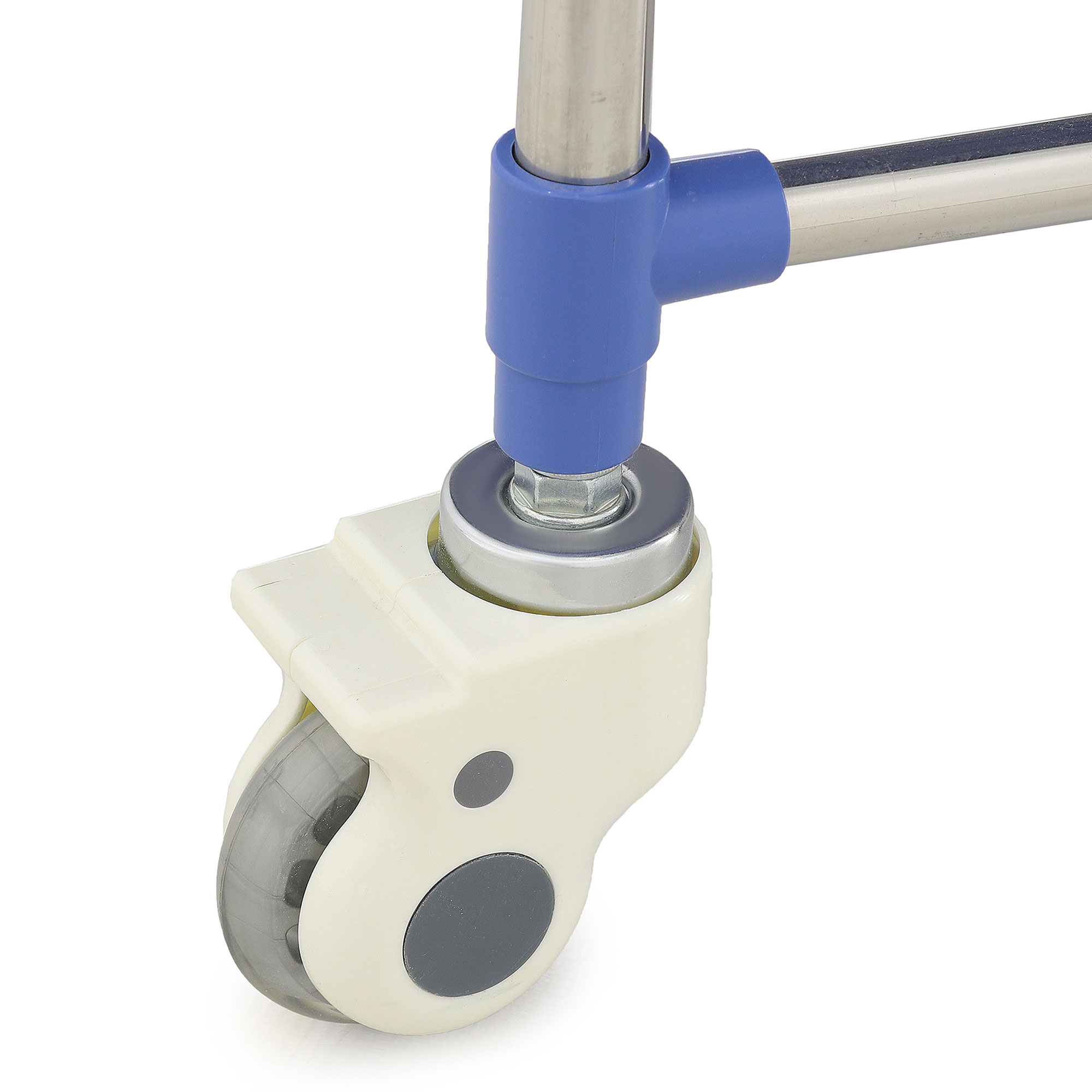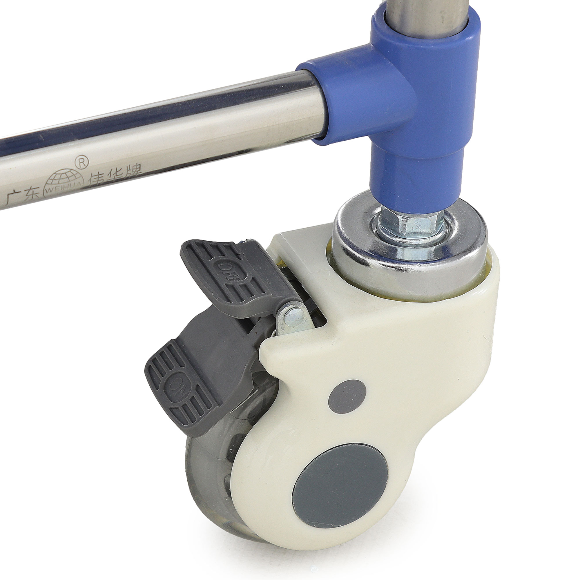 - Маневренные колеса диаметром 80 мм, оснащенные диагональными тормозами, гарантируют стабильность и легкое перемещение тележки, а также надежную фиксацию на месте.