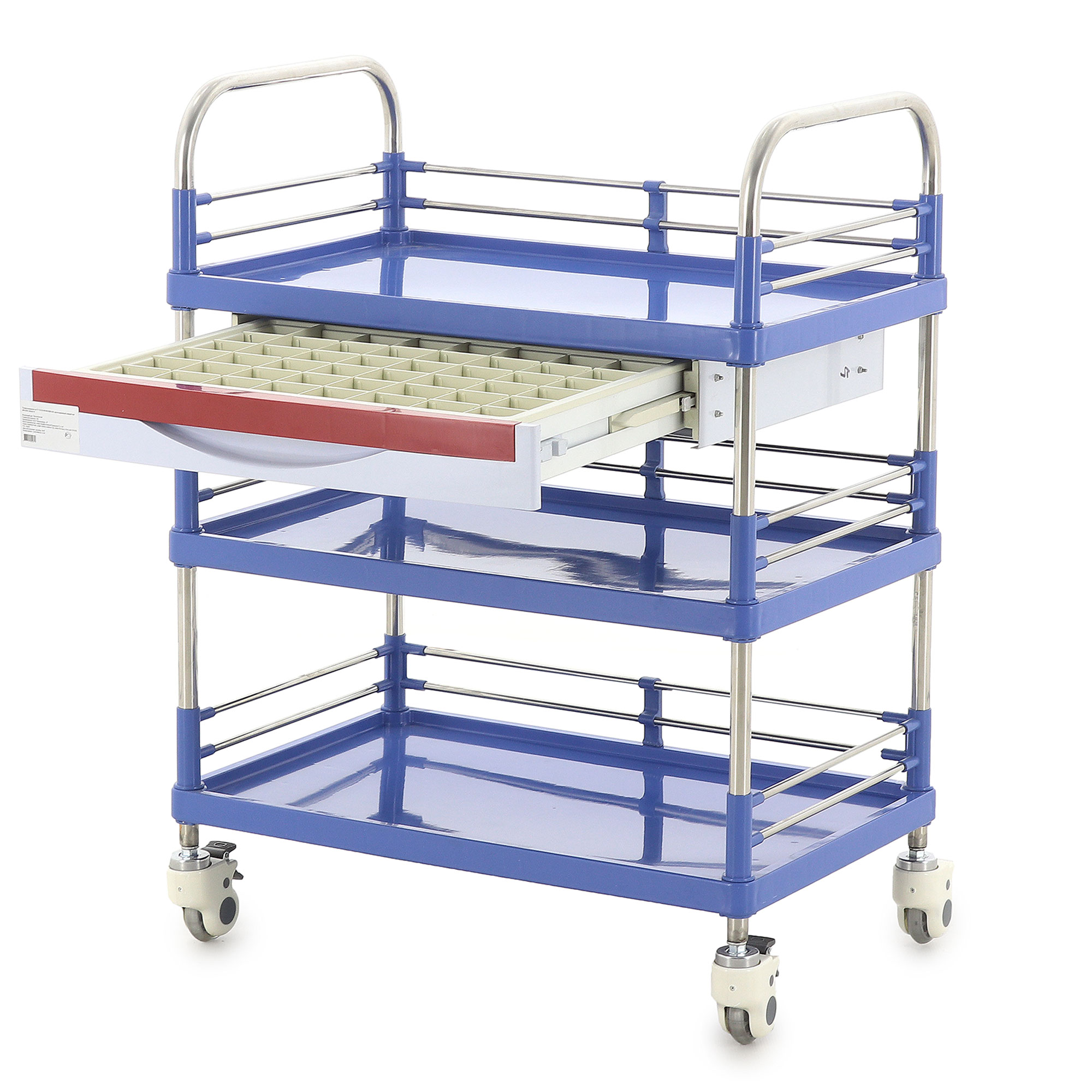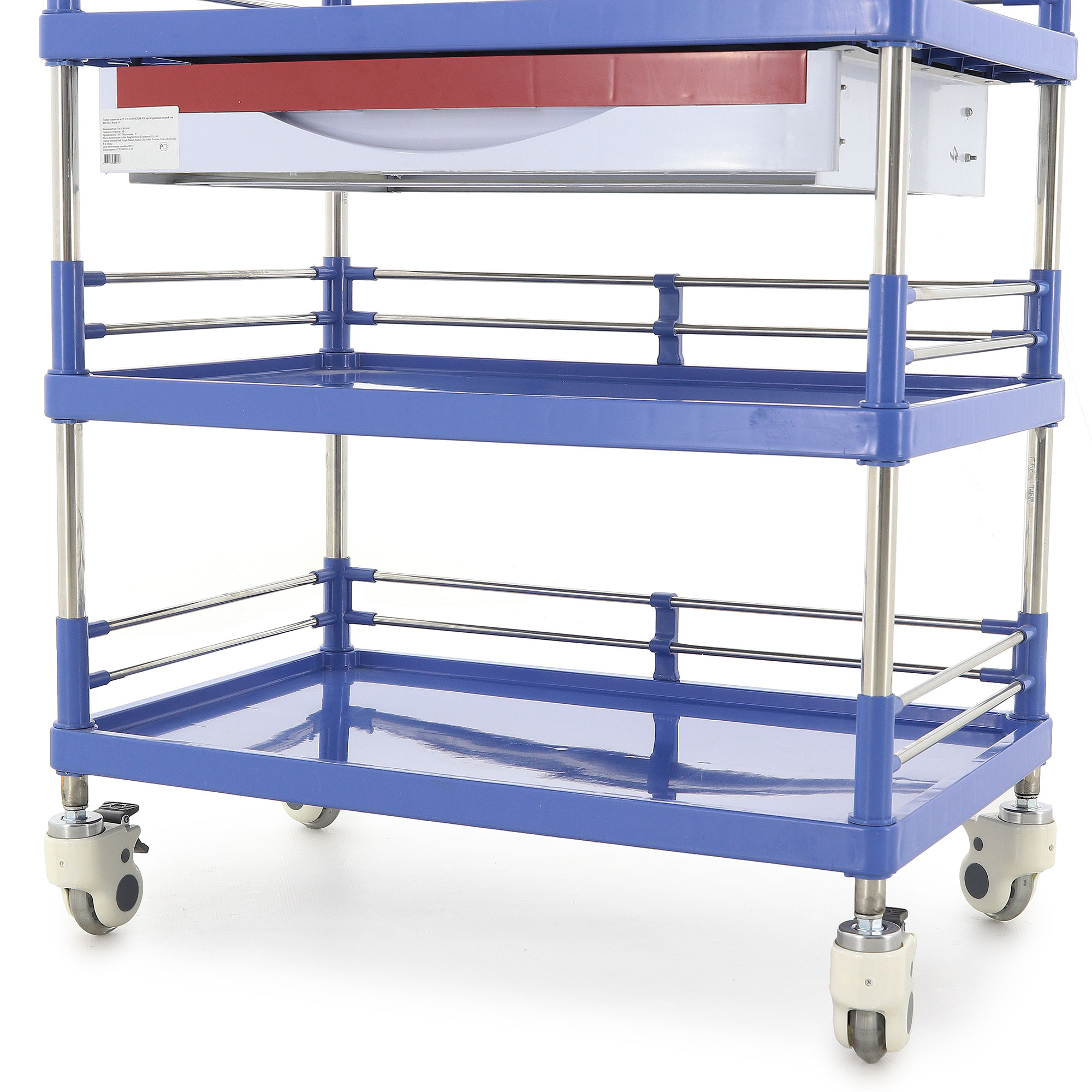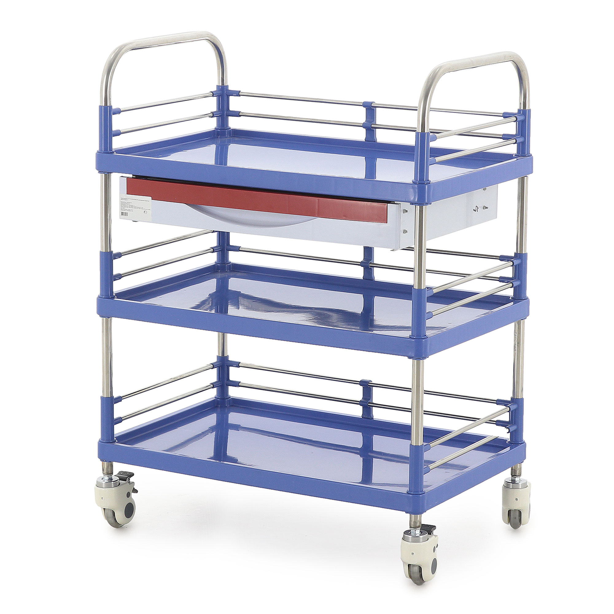 Высота боковых ограждений составляет 85 мм, а расстояние между ящиком и полкой – 257 мм, что обеспечивает легкий доступ к содержимому. Диаметр колес 80 мм в сочетании с диагональными тормозами гарантирует легкое перемещение и надежную фиксацию тележки в нужном положении. Изготовленная из нержавеющей стали, АБС-пластика и полиуретана, тележка отличается высокой устойчивостью к износу и легкостью в уходе. Вес нетто составляет 15,4 кг, а вес брутто – 20,4 кг, что свидетельствует о ее прочности и надежности.