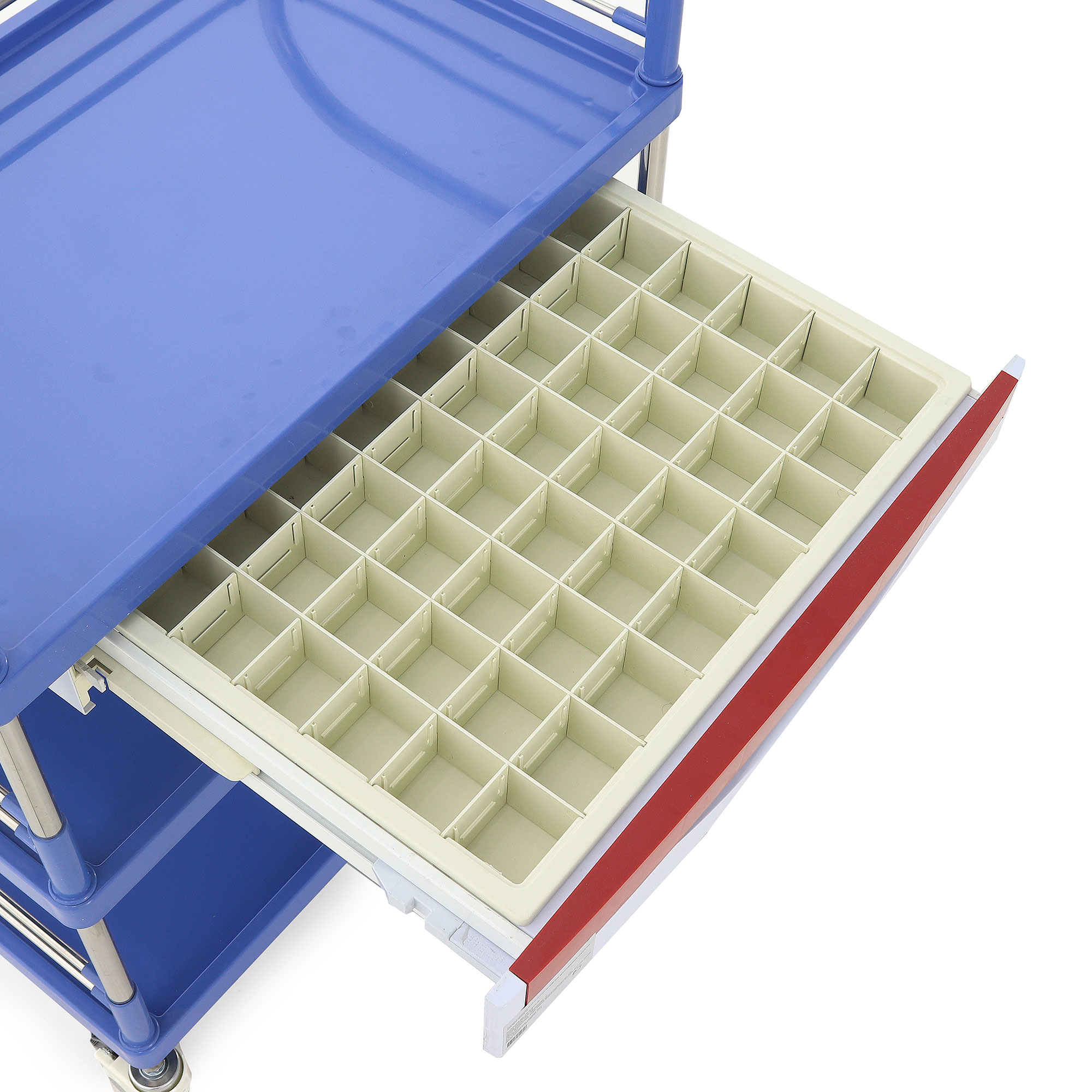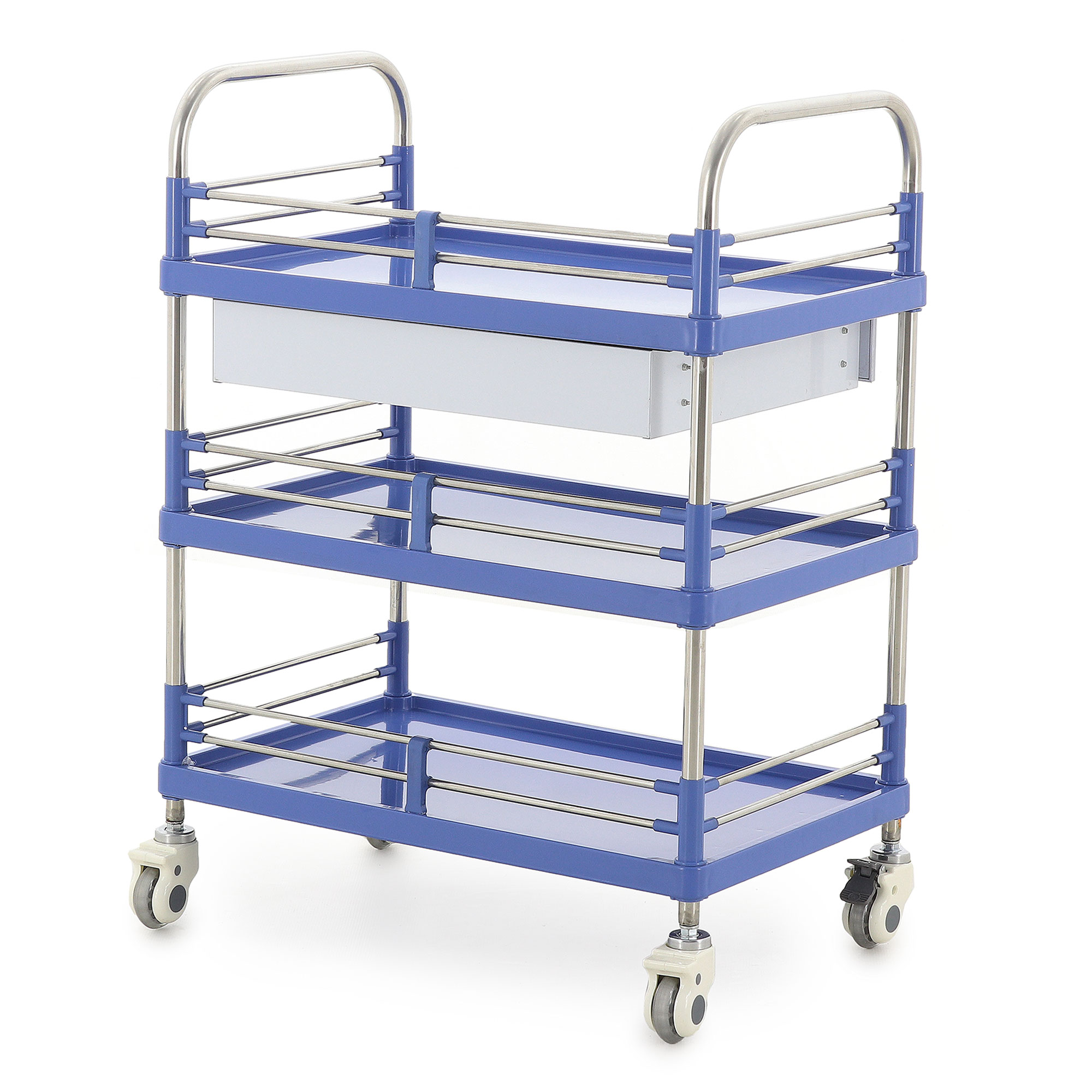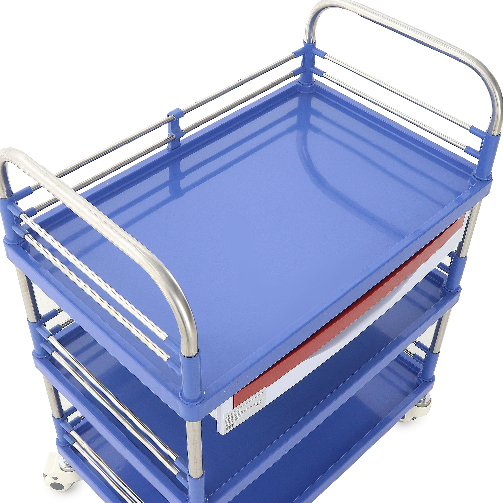 Высота боковых ограждений составляет 85 мм, а расстояние между ящиком и полкой – 257 мм, что обеспечивает легкий доступ к содержимому. Диаметр колес 80 мм в сочетании с диагональными тормозами гарантирует легкое перемещение и надежную фиксацию тележки в нужном положении. Изготовленная из нержавеющей стали, АБС-пластика и полиуретана, тележка отличается высокой устойчивостью к износу и легкостью в уходе. Вес нетто составляет 15,4 кг, а вес брутто – 20,4 кг, что свидетельствует о ее прочности и надежности.