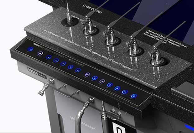 В комплектацию Chammed CU-5000 включена система стерилизации для эндоскопов, что подчеркивает высокий стандарт гигиены и безопасности. Продуманный дизайн предусматривает выдвижной столик для клавиатуры и свободное пространство для размещения персонального компьютера, обеспечивая максимальное удобство рабочего места врача.