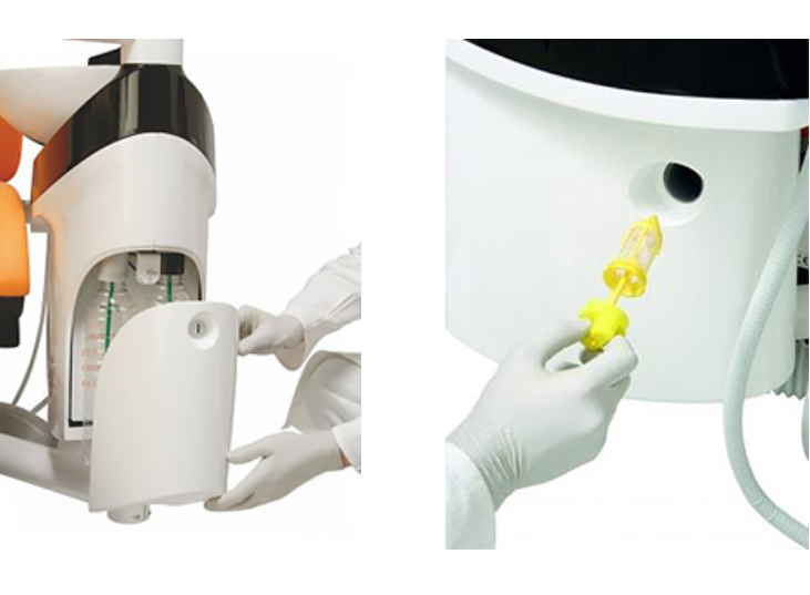 Поворотная фарфоровая чаша плевательницы легко снимается и стерилизуется в автоклаве. Предусмотрены системы для центрального отсасывания, включая эжекторную систему, сепарационные автоматики и ловушки для амальгамы. Система быстросъемных крышек обеспечивает легкий доступ ко всем фильтрам. Встроенные сосуды для чистой воды и дезинфекционного раствора, а также оптические и акустические индикации их уровня, гарантируют удобство использования и поддержания гигиены. Дополнительно блок плевательницы может быть оснащен системой дезинфекции внутренней проводки воды, нагревом воды, переключающим клапаном для выбора источника воды и системой постоянной дезинфекции аспирационных шлангов.