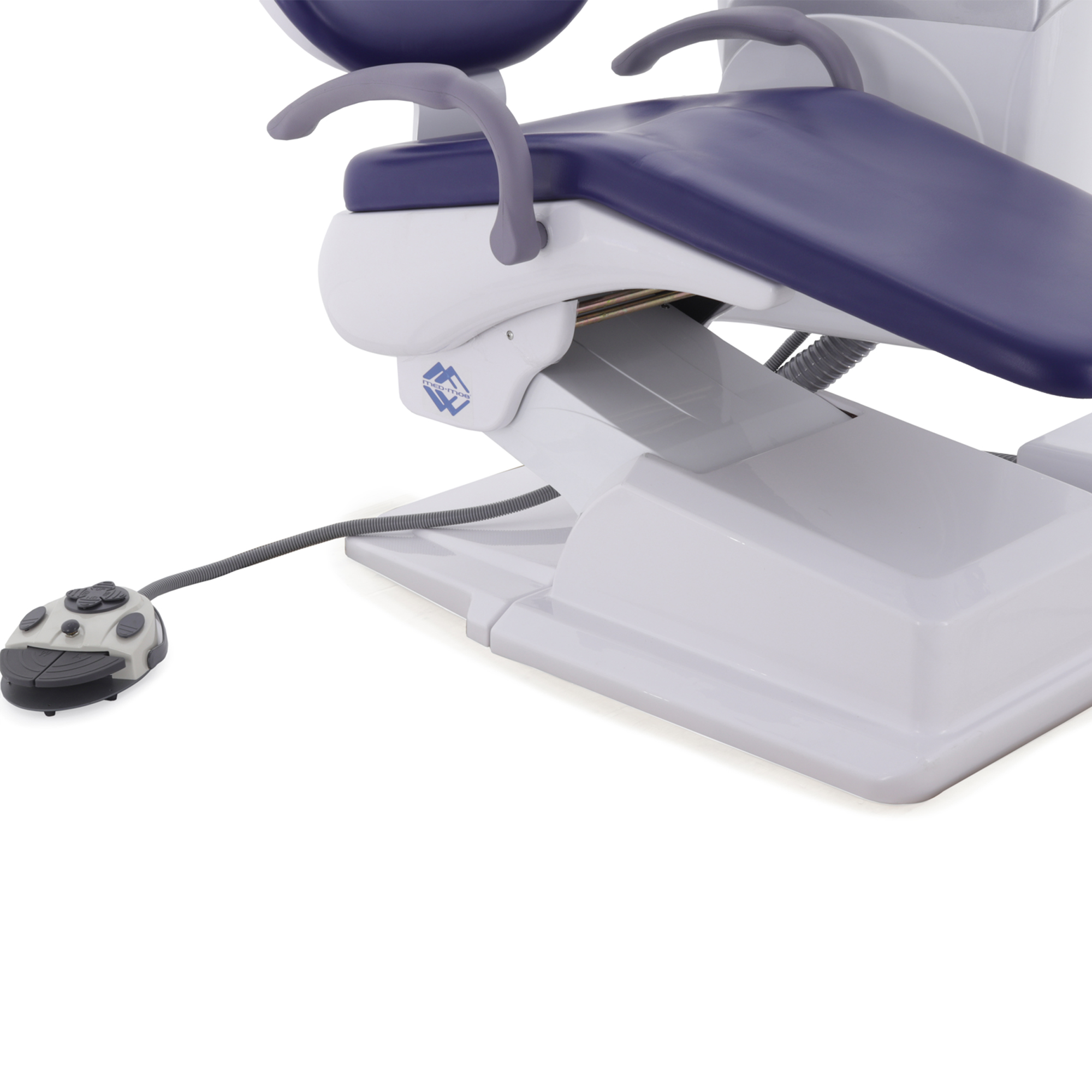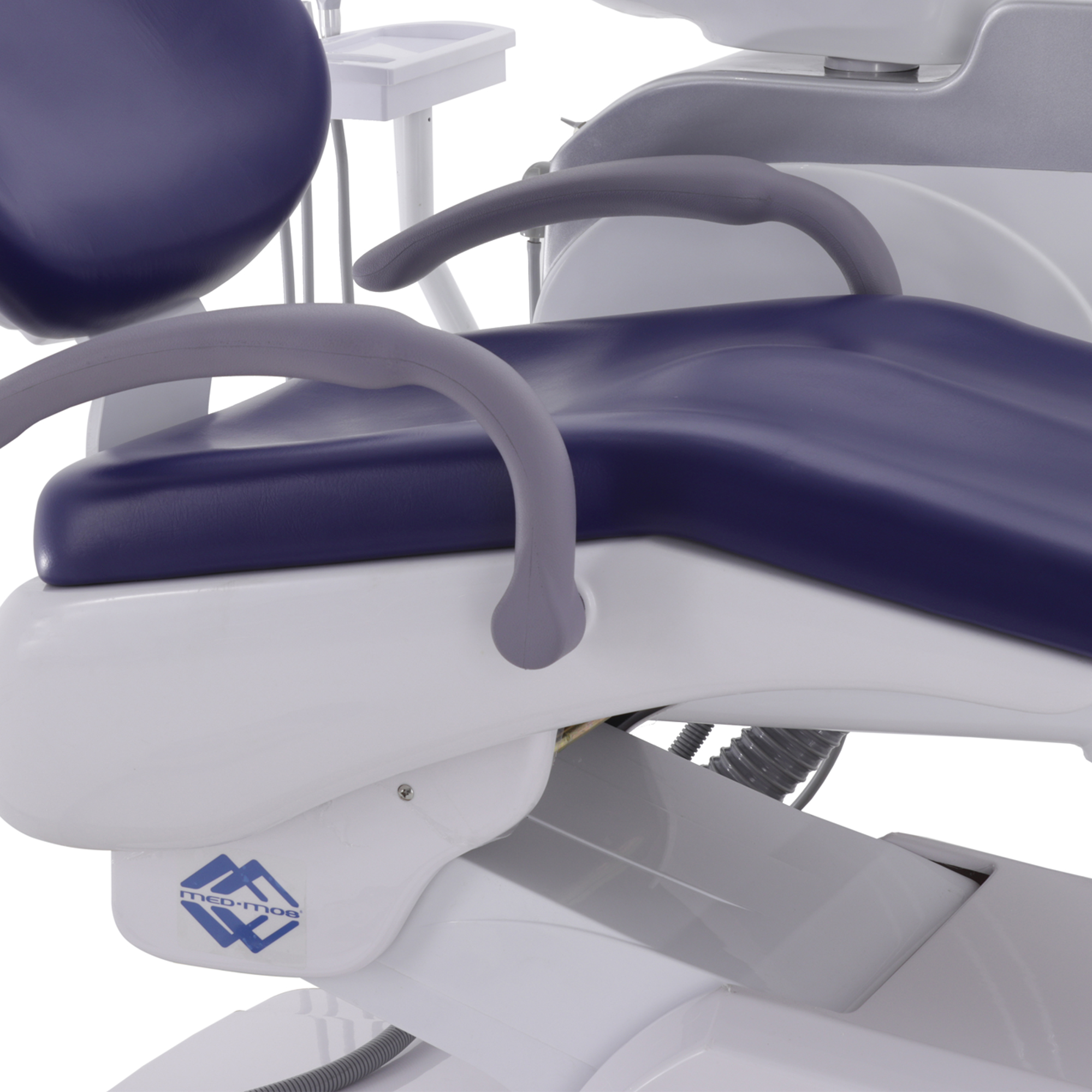 Кресло пациента спроектировано для оптимального комфорта, имеет правый откидной подлокотник и два независимых двигателя, позволяющих точно регулировать положение. Гидроблок включает поворотную керамическую плевательницу, емкость для дистиллированной воды и выносной блок коммуникаций, упрощая гигиенические процедуры и обслуживание.