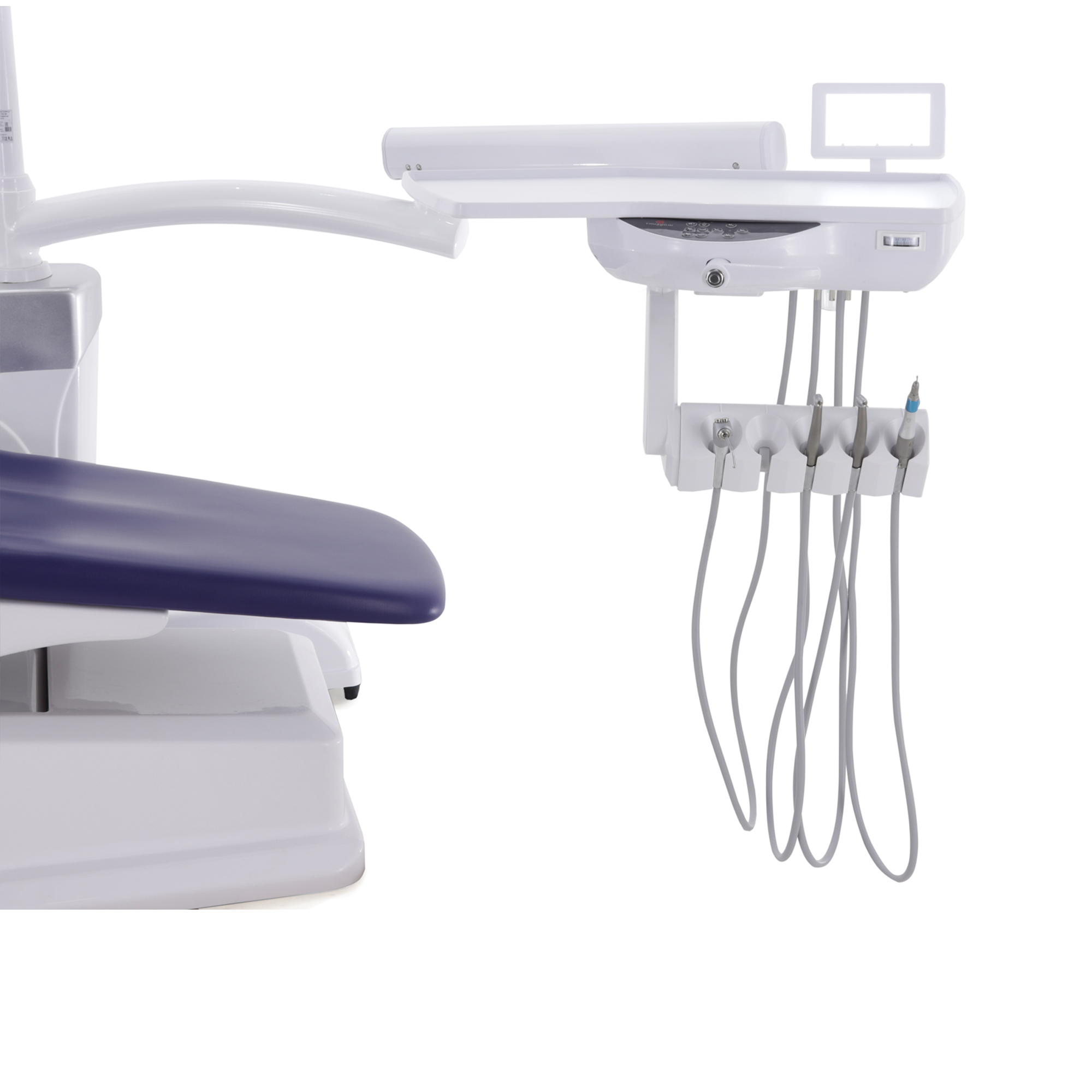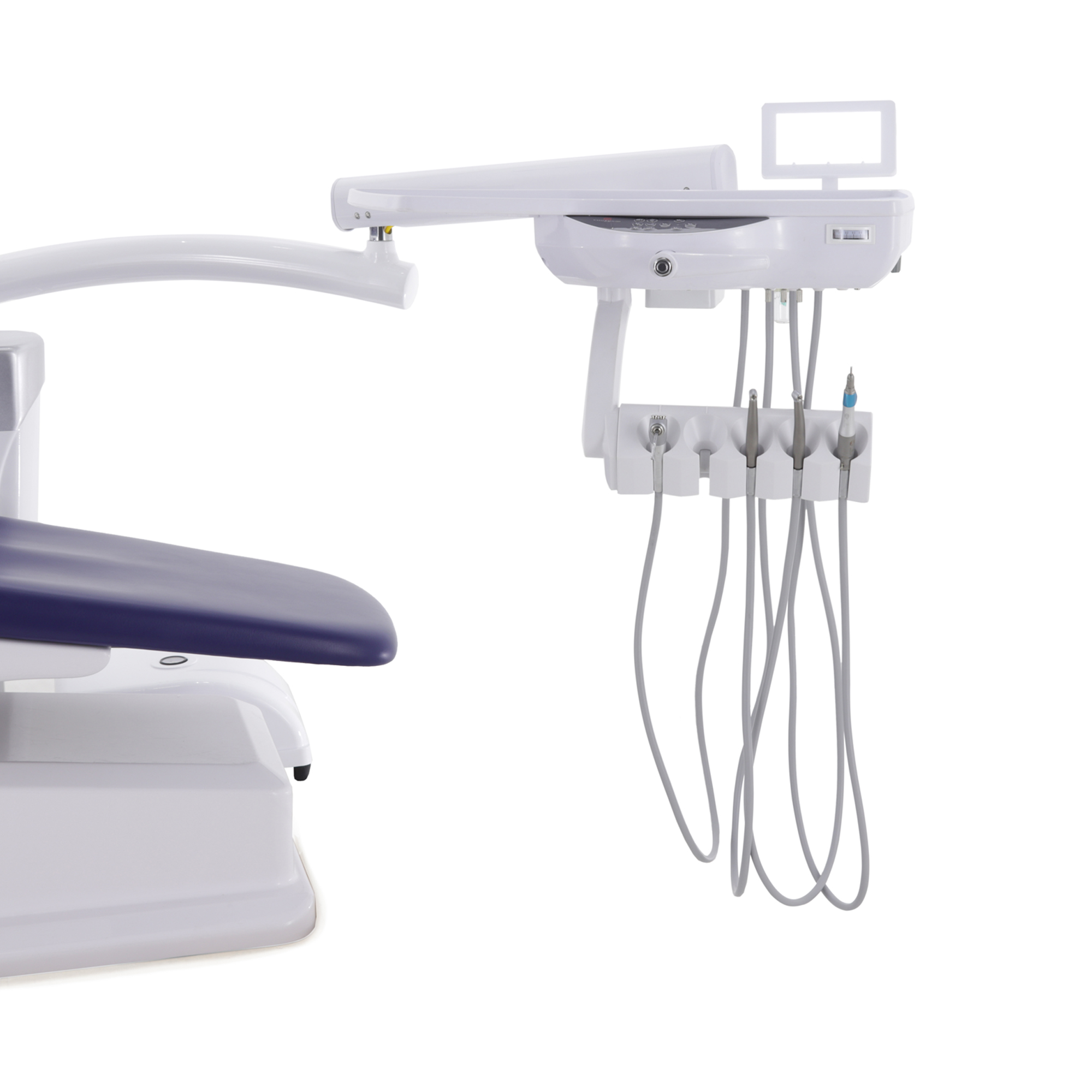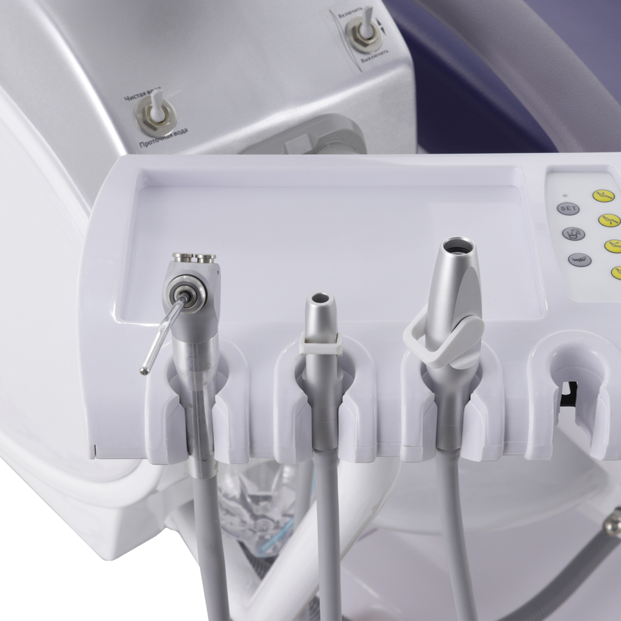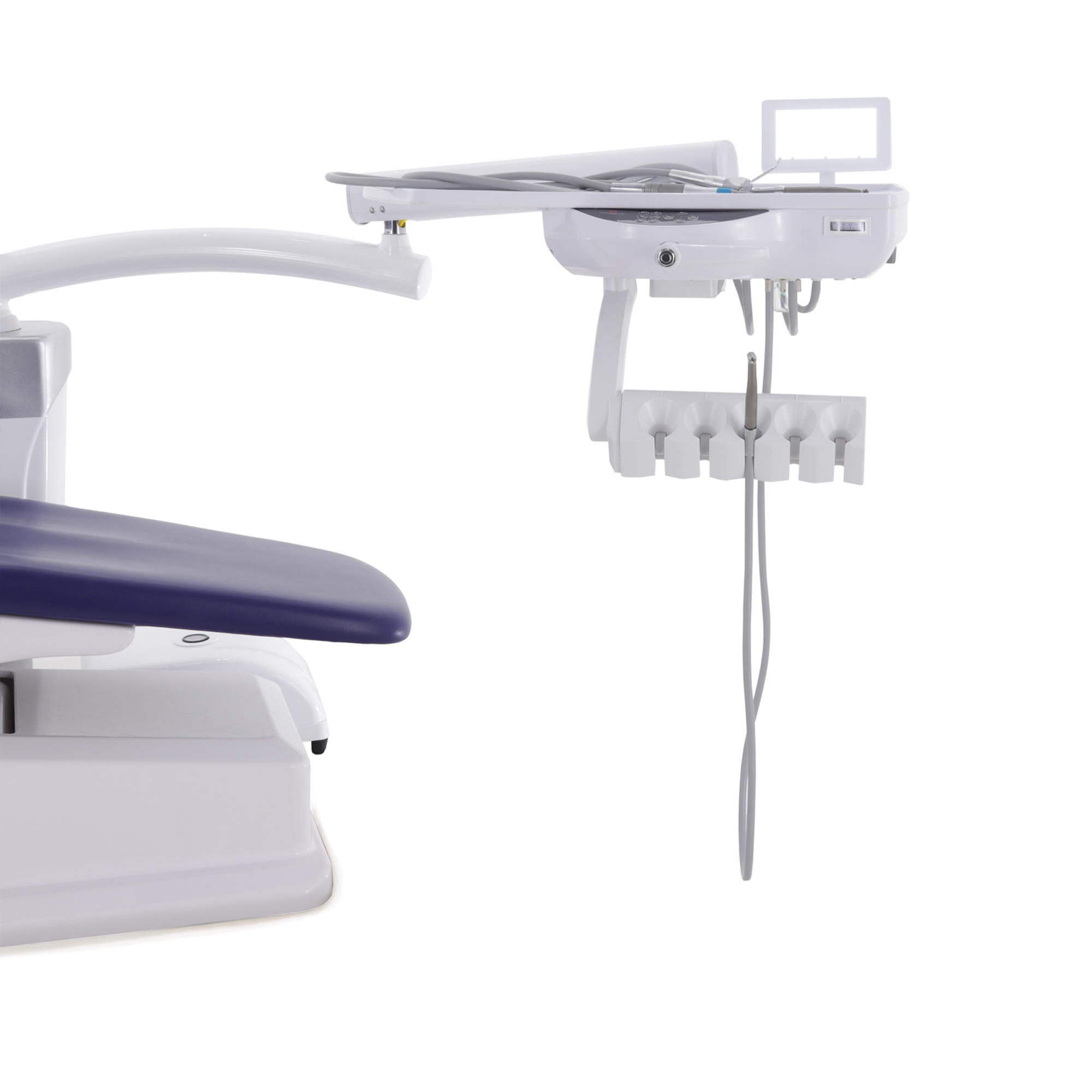 Блок ассистента на поворотной штанге оснащен эжекторным слюноотсосом, пылесосом и пистолетом "вода/воздух", а также дополнительным портом для установки инструмента, что расширяет возможности и повышает оперативность взаимодействия с ассистентом.