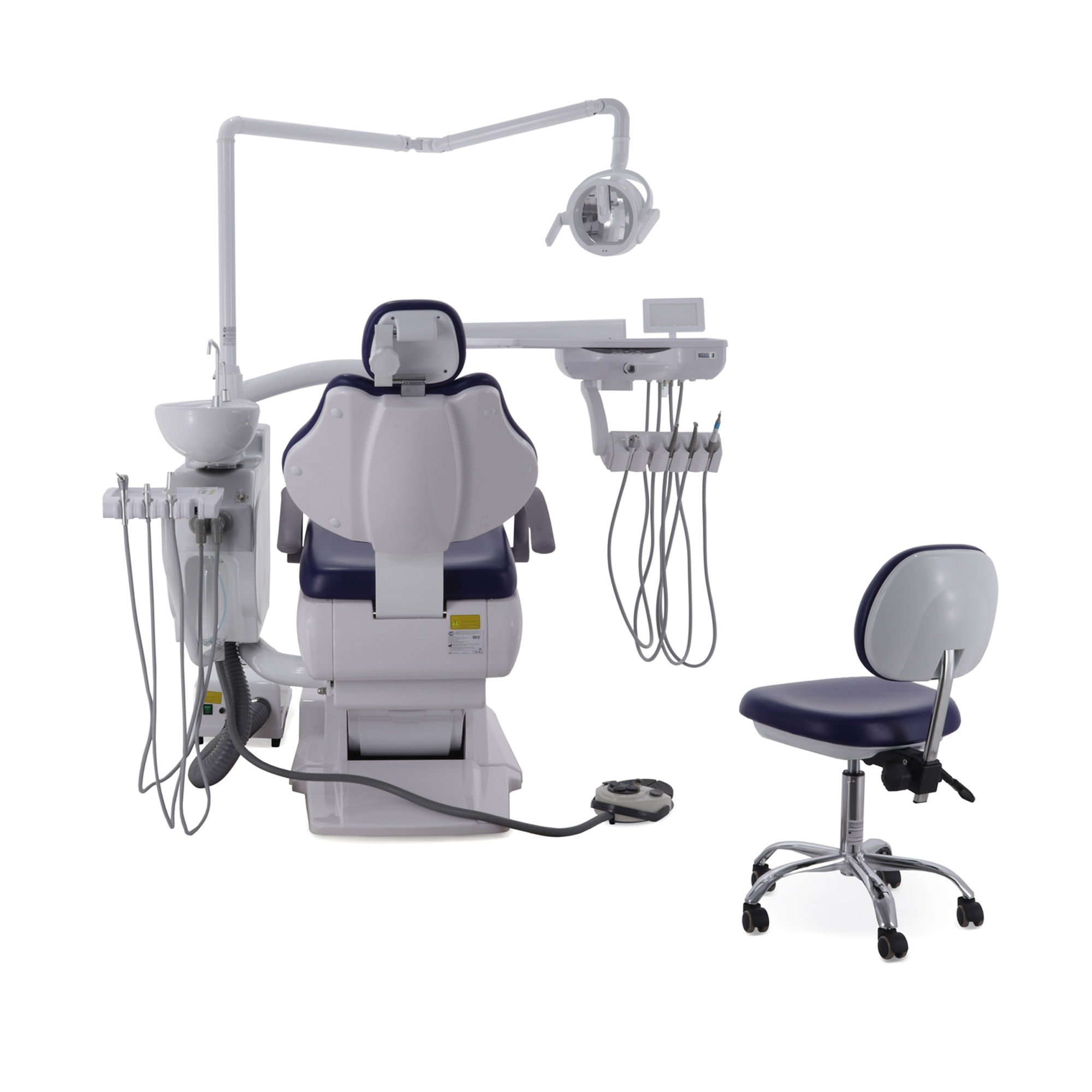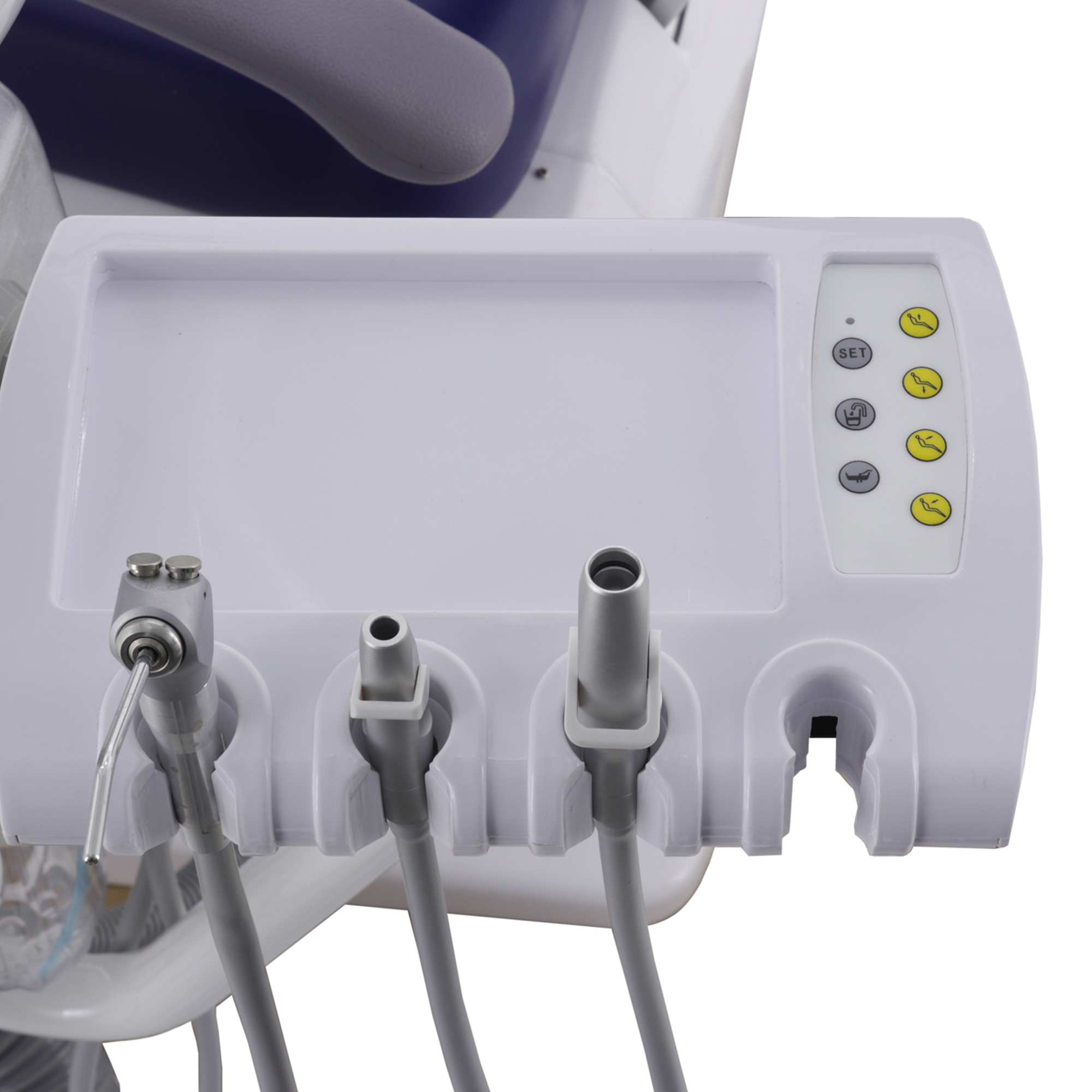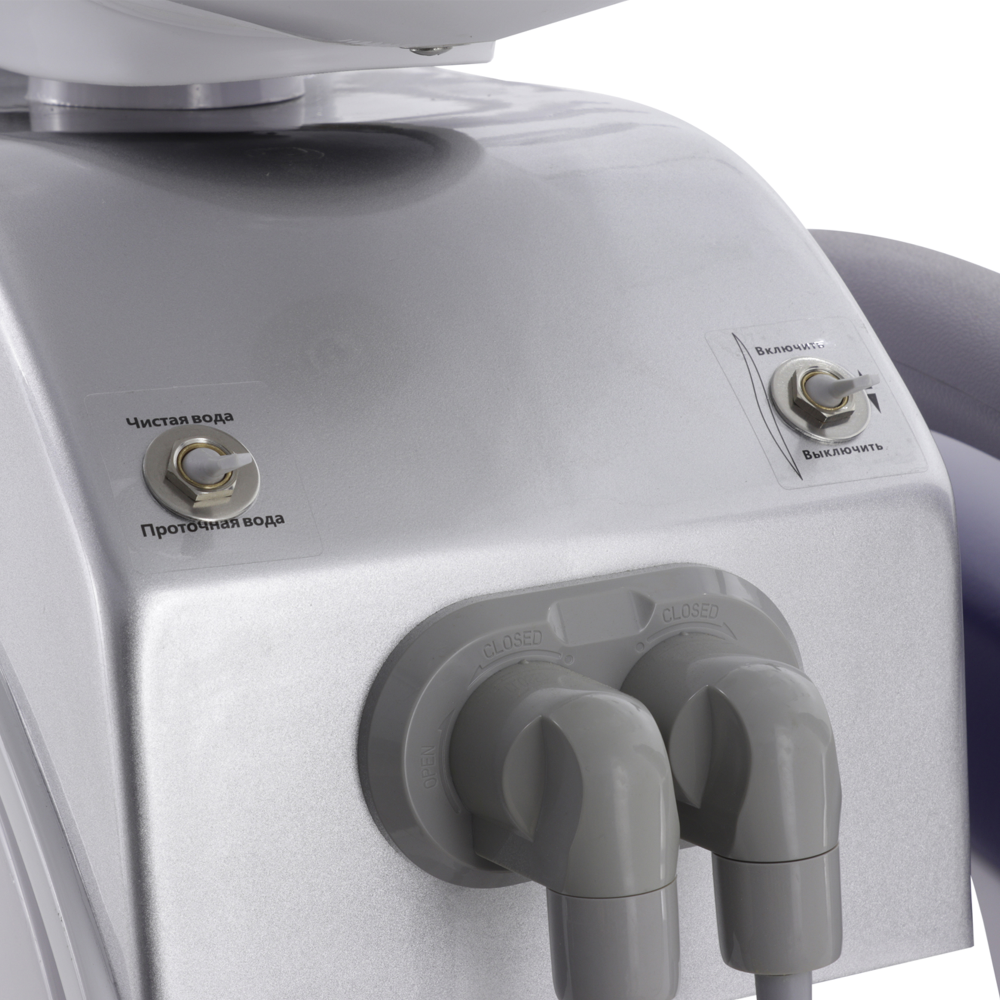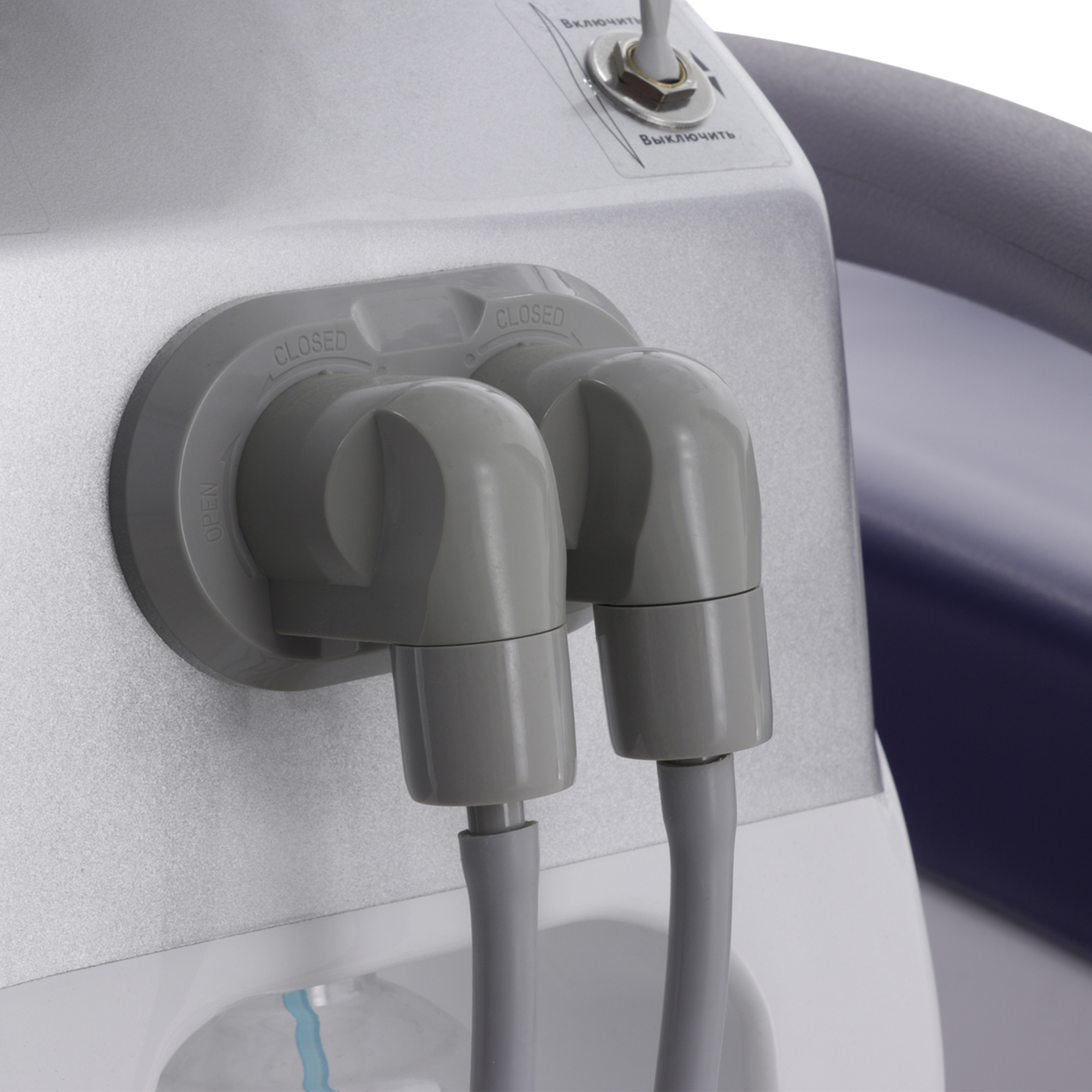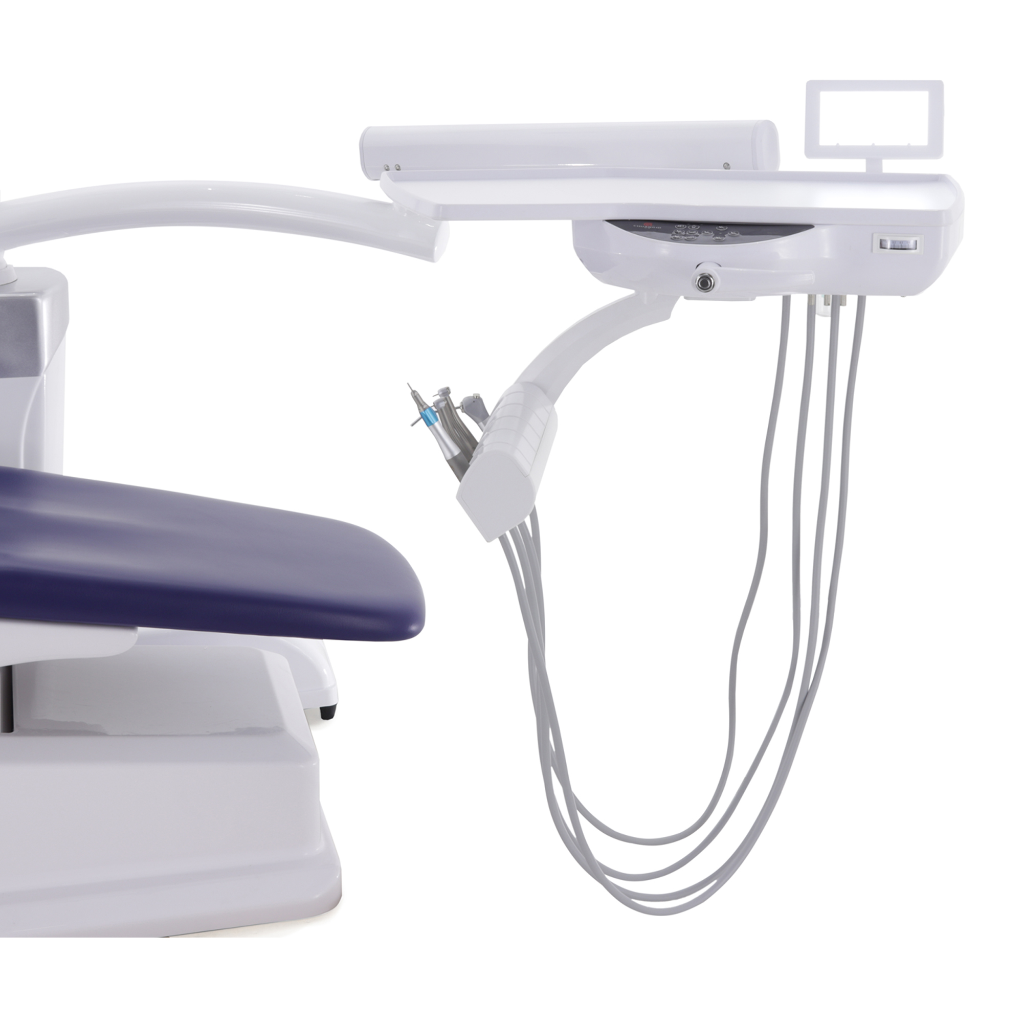 Блок ассистента на поворотной штанге оснащен эжекторным слюноотсосом, пылесосом и пистолетом "вода/воздух", а также дополнительным портом для установки инструмента, что расширяет возможности и повышает оперативность взаимодействия с ассистентом.