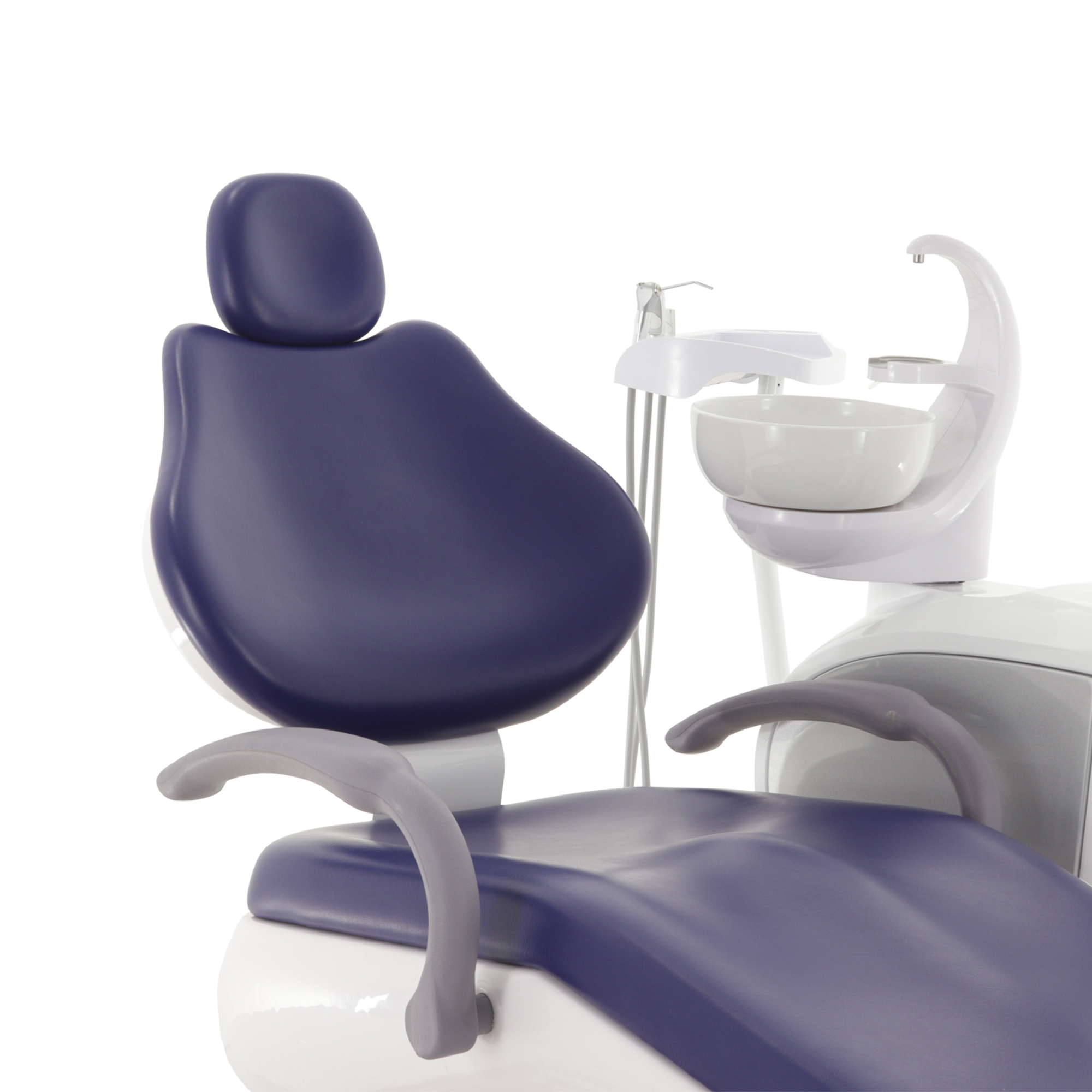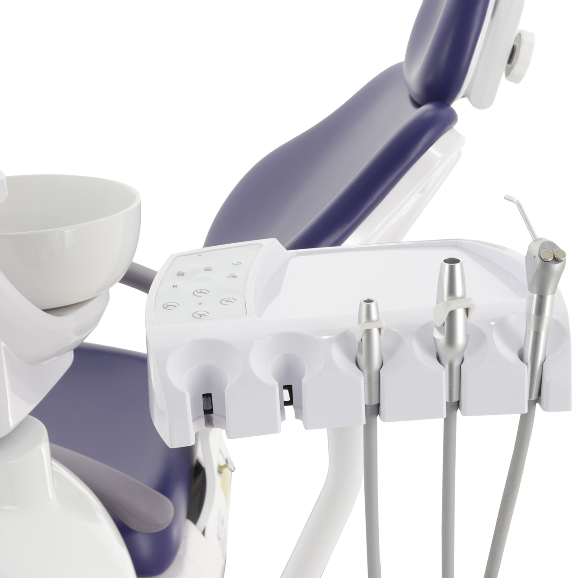 - Блок ассистента: Расположен на поворотной изогнутой штанге и оснащен эжекторным слюноотсосом, пылесосом, пистолетом вода/воздух, а также дополнительным портом для установки инструмента, что оптимизирует работу ассистента.
