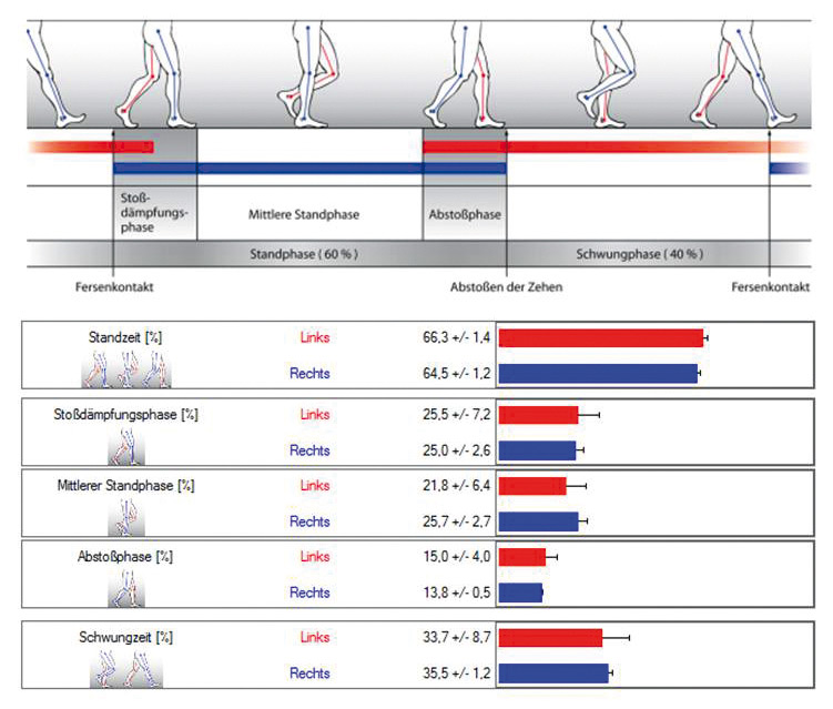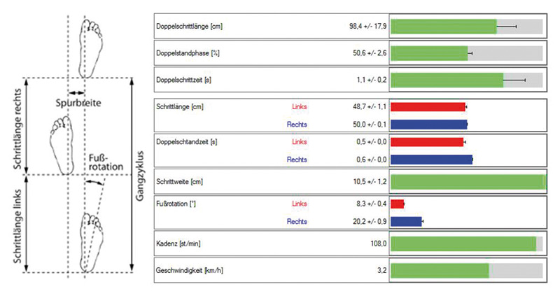 - Статический и динамический анализ распределения давления стоп: DIERS pedogait позволяет фиксировать функциональное распределение давления стоп при ходьбе, используя интегрированную измерительную платформу длиной 1 метр. Благодаря частоте измерений 100 Гц (1 измерение в 10 мс) достигается исключительная точность, минимизирующая погрешности и артефакты.