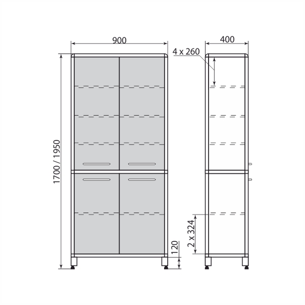- Полки: Выполнены из ЛДСП. Модели высотой 1700 мм отличаются от моделей высотой 1950 мм количеством полок.