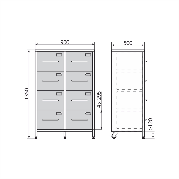 - Интегрированные колесные опоры сзади значительно упрощают перемещение шкафа внутри помещения, минимизируя физические усилия персонала.