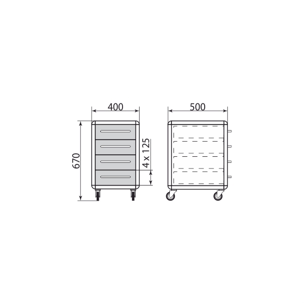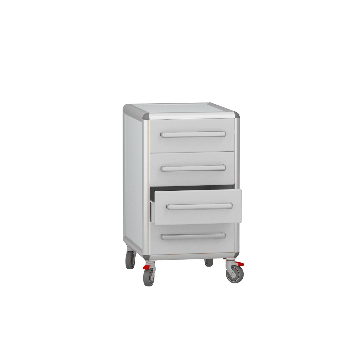 - Колеса: изготовлены из термопластичной резины, специально разработанной для медицинских помещений, не оставляют следов на напольных покрытиях и обеспечивают легкое перемещение тумбы.