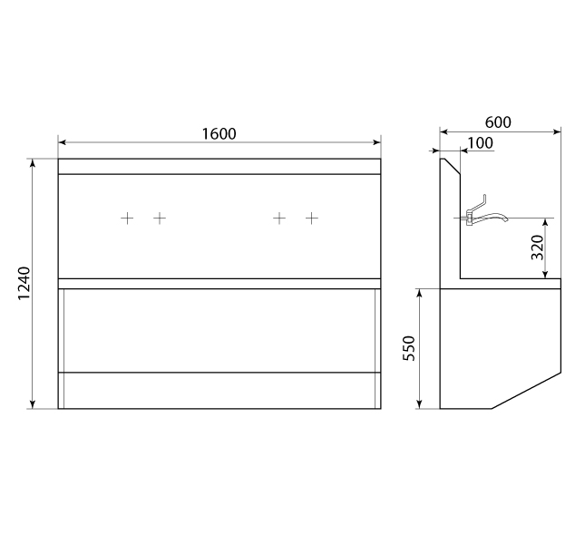 - Хирургическая настенная мойка: Изготовлена из нержавеющей стали AISI 304, обеспечивающей надежность и легкость в обработке.