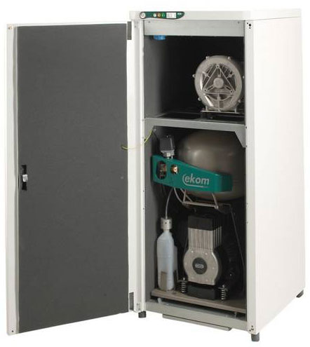 Компрессор EKOM DUO2V, DUO с 25-литровым воздушным резервуаром и отсасывающим агрегатом — оптимальное решение для одной или двух стоматологических установок, оснащенных вытяжным блоком, обеспечивая чистоту и эффективность вашей практики.