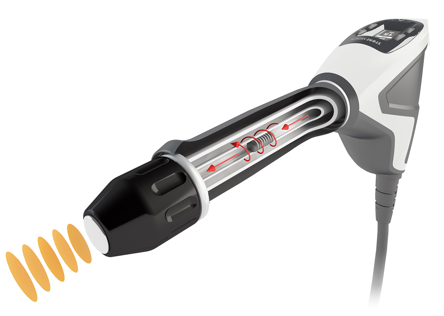 Новый эргономичный RSW-аппликатор для радиальных волн оснащен уникальным встроенным управлением. Его амортизирующие и противоскользящие элементы обеспечивают надежный хват, а вес минимизирован до 500 г. Дисплей на рукоятке отображает основные параметры: давление, частоту и количество импульсов. Полный контроль над всеми параметрами доступен прямо с рукоятки. Датчик активации импульсов при касании кожи и индикатор боли повышают комфорт и безопасность процедуры.