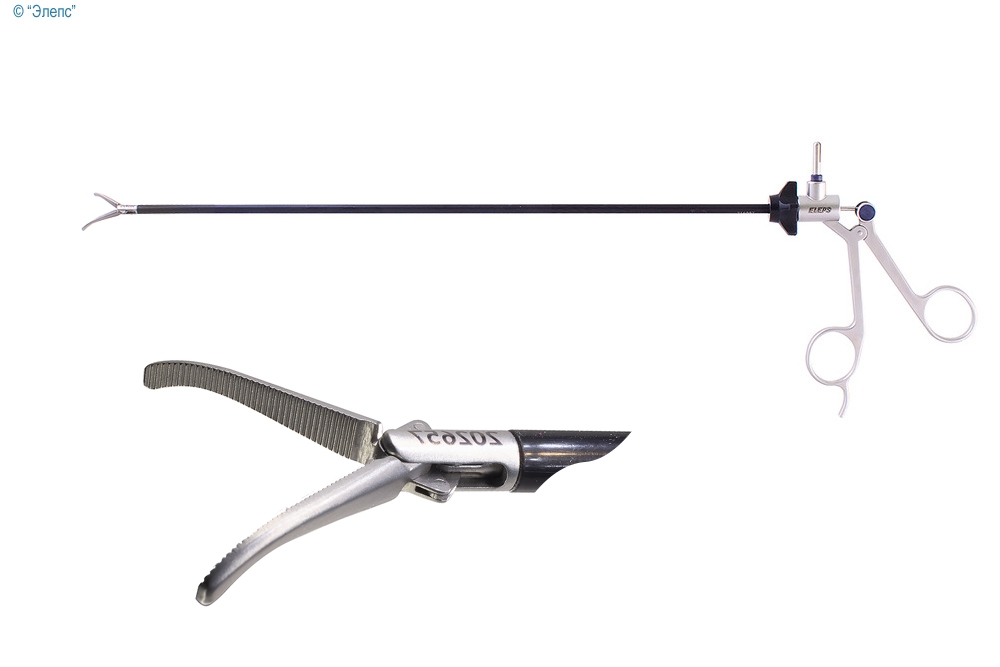 Зажим ELEPS оснащен металлической рукояткой без кремальеры, что обеспечивает удобство и надежность при длительной работе. Диаметр рабочей части составляет 5 мм, а длина рабочей части инструмента — не менее 370 мм, что позволяет работать в глубоких полостях. Длина бранш не превышает 20 мм, с мелкой поперечной насечкой на внутренней поверхности для надежного захвата и удержания тканей.