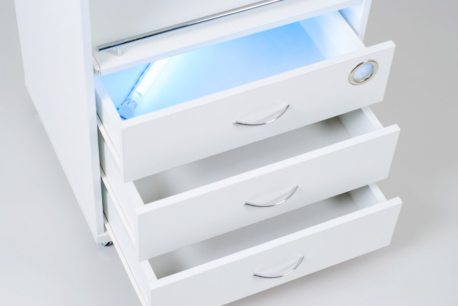 Тумба педикюрная «Италика» — это образец продуманного дизайна и многофункциональности для современного специалиста. Она превосходит аналоги за счет интегрированного УФ-модуля и выдвижной полки, а также увеличенной рабочей поверхности, что позволяет оптимально организовать рабочее пространство, разместив всё необходимое оборудование и инструменты в пределах легкой доступности. Благодаря оснащению прорезиненными колесиками, тележка обеспечивает бесшумное и плавное перемещение по любому напольному покрытию.