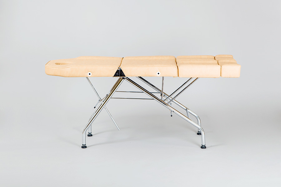 Механические регулировки спинки, сиденья и ножных секций обеспечивают точную настройку под индивидуальные потребности каждого пациента. Выдвижные подушки на каждой ноге повышают удобство во время длительных сеансов. В спинке кресла предусмотрено специальное отверстие для лица, которое закрывается съемной подушкой, гарантируя дополнительный комфорт.
