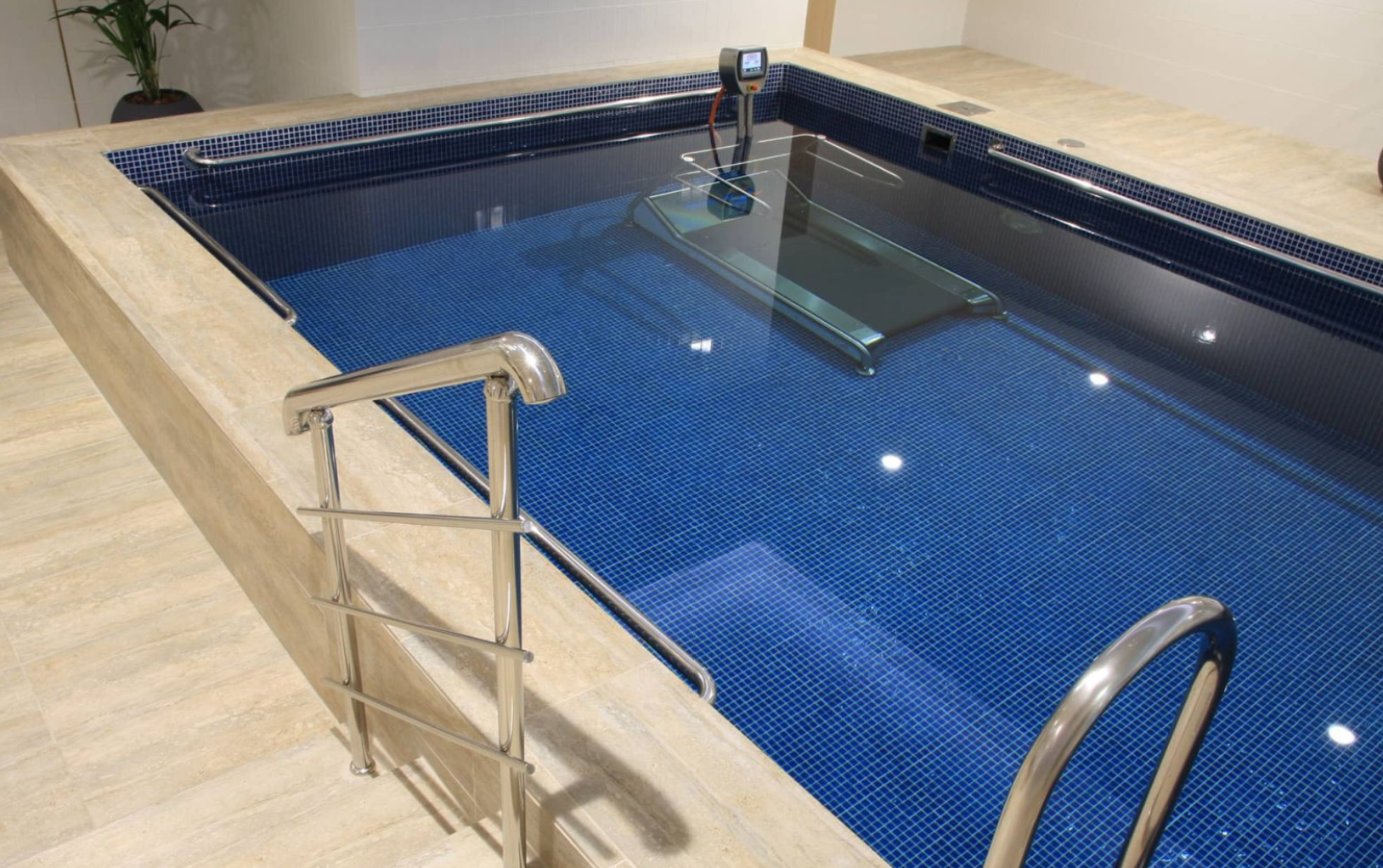 - сама подводная беговая дорожка, располагаемая в бассейне, оснащена локальным пультом управления с ЖК-дисплеем. На дисплее отображаются скорость, оставшееся время процедуры, а также кнопка аварийной остановки. Боковые поручни данной модели стационарны;