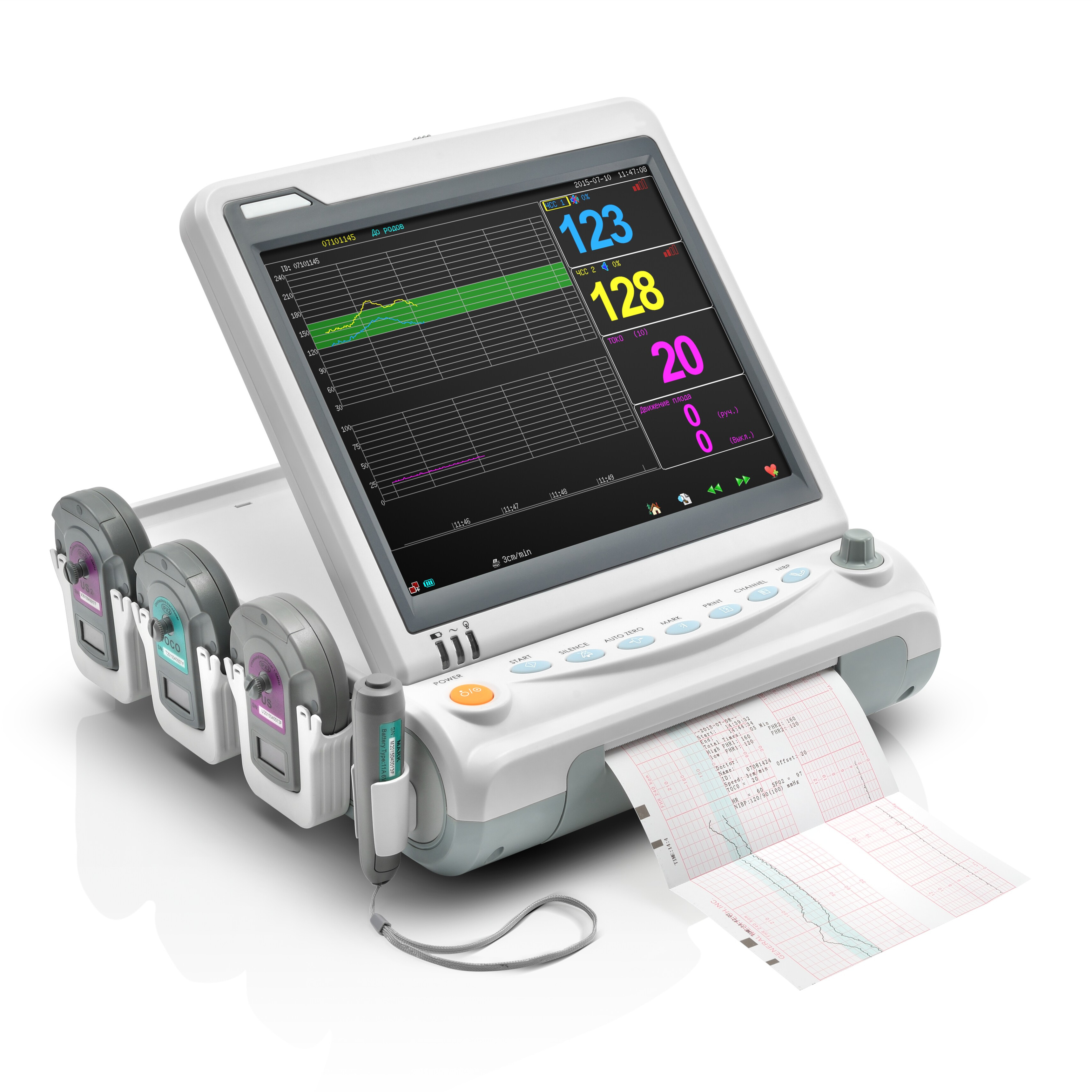 - Интуитивный дисплей: Цветной TFT LCD дисплей с диагональю 12,1 дюймов и регулируемым углом наклона обеспечивает четкое отображение до трех кривых одновременно (ЧСС плода, токометрия, подвижность плода). Режим крупных цифр позволяет легко считывать параметры на расстоянии.