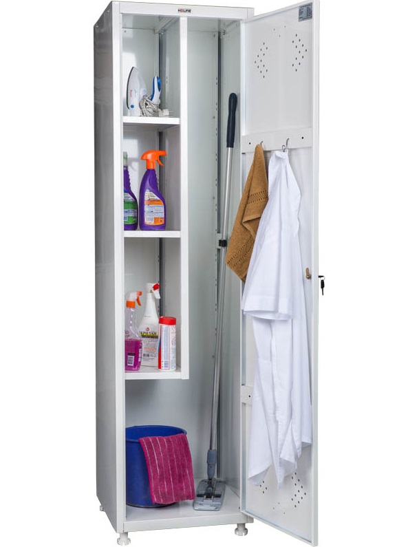 - Внутреннее пространство шкафа рационально организовано благодаря вертикальной перегородке, трём полкам для различных принадлежностей, а также специальному держателю для швабры и удобным крючкам.