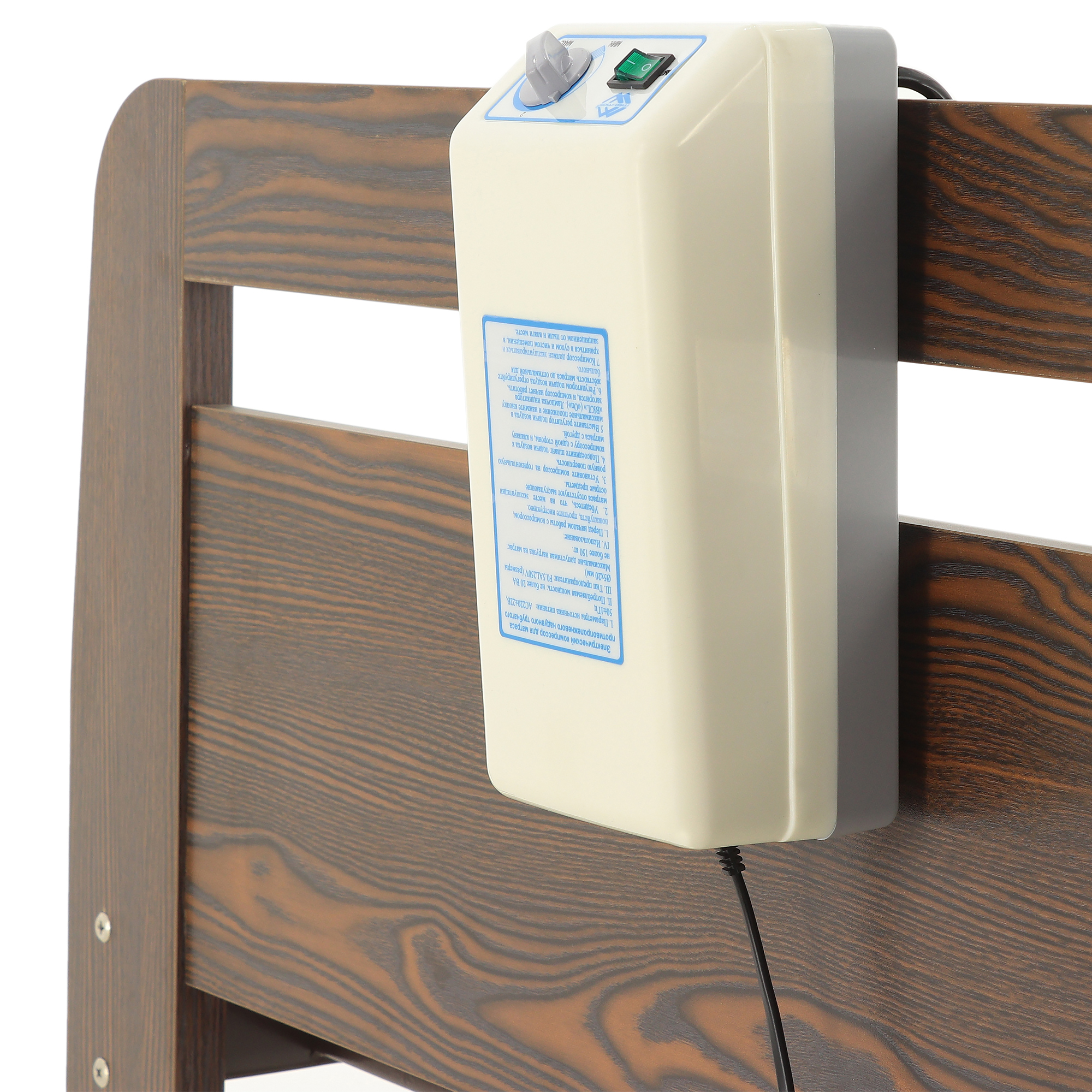 - Воздушный компрессор (1 шт.): компактное и бесшумное устройство, поддерживающее оптимальное давление в камерах матраса.