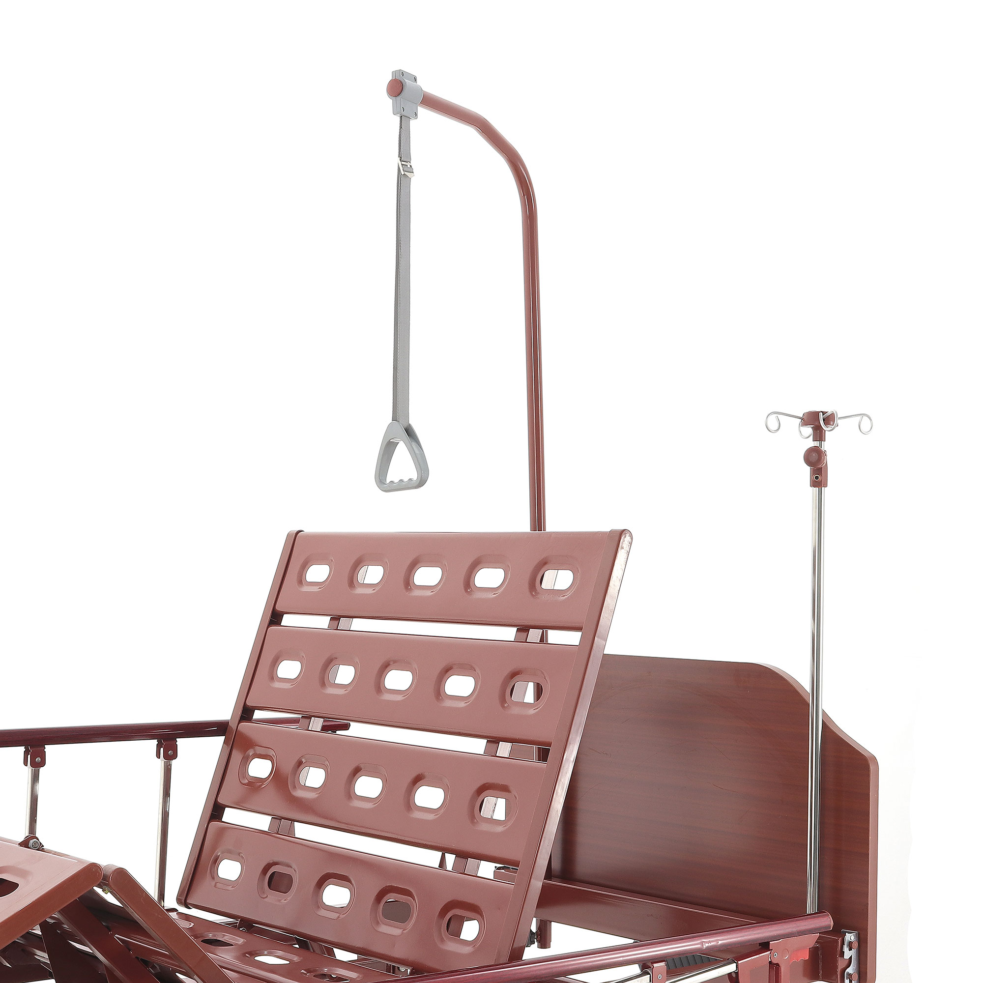 Для обеспечения безопасности пациентов предусмотрены боковые алюминиевые ограждения. При этом съемные деревянные спинки придают кровати более домашний и уютный вид, способствуя созданию комфортной атмосферы, которая так важна для психологического состояния пациента.