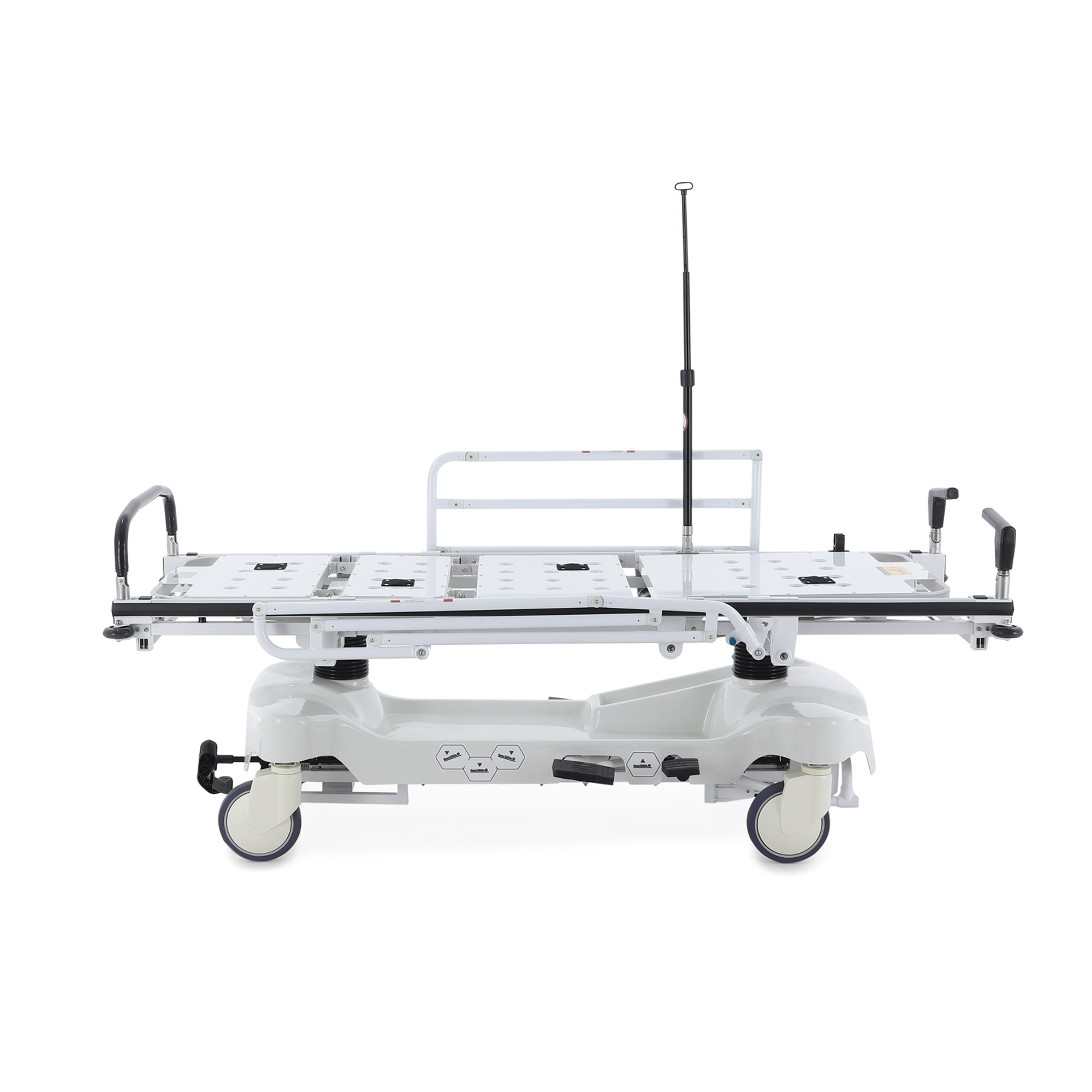 - Высота каталки легко адаптируется благодаря интуитивно понятной гидравлической ножной педали, позволяя быстро и точно настроить оптимальную высоту для выполнения различных процедур и безопасной транспортировки.