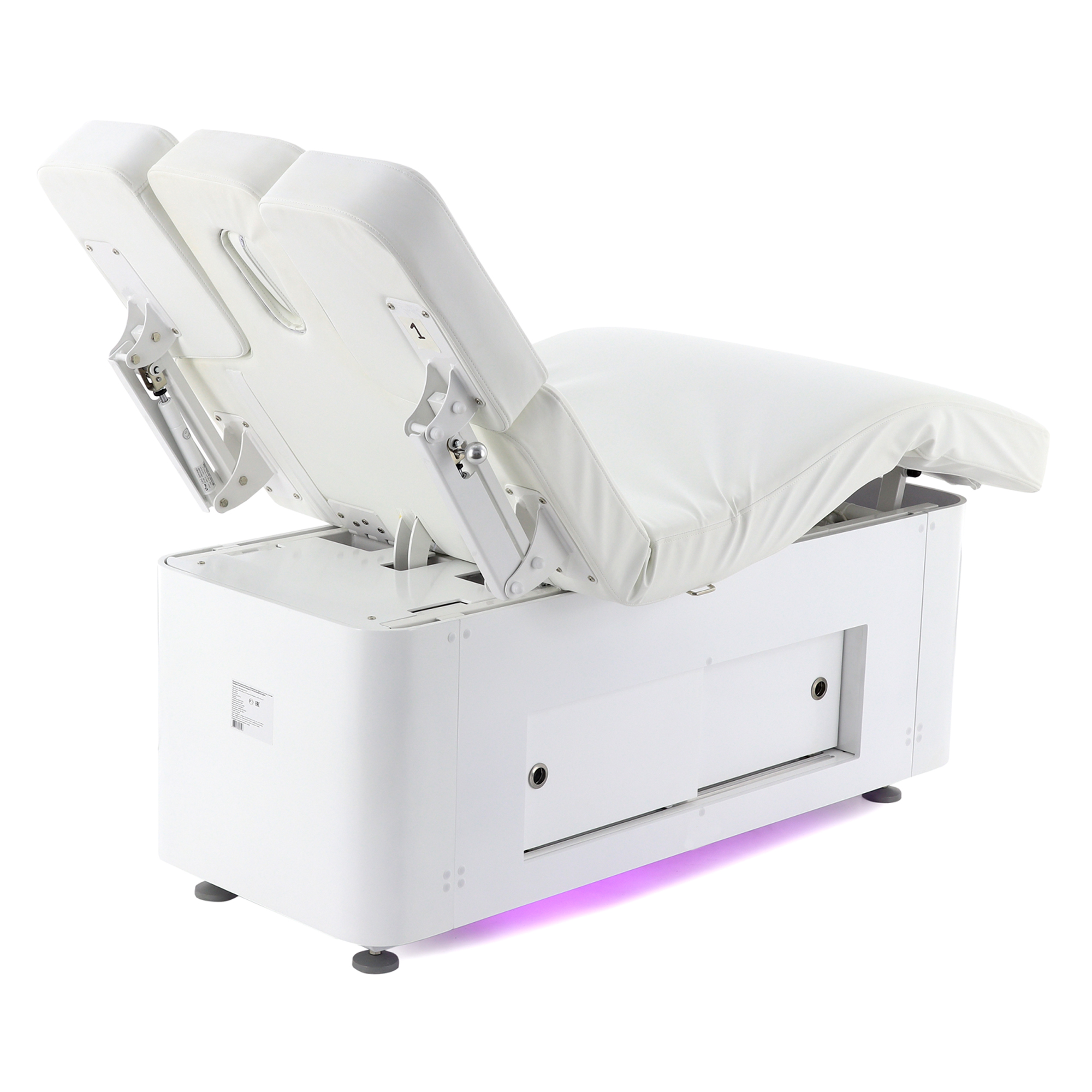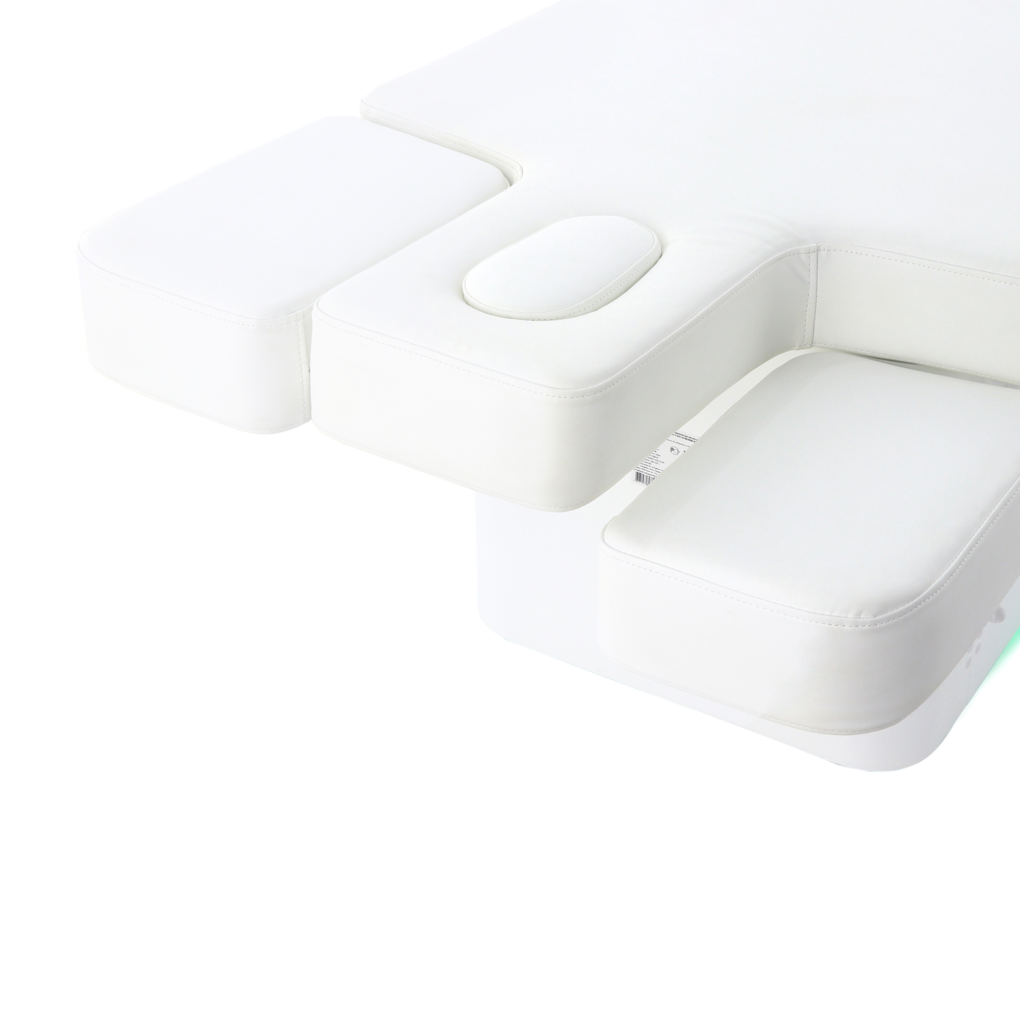 Широкие, эргономичные подлокотники, встроенные в спинную секцию, регулируются по высоте, обеспечивая оптимальное положение рук пациента во время массажных процедур, снимая напряжение в предплечьях и лопаточной области. Интегрированная декоративная подсветка в нижней части основания создаёт расслабляющую и приятную атмосферу, способствуя полному расслаблению пациента.