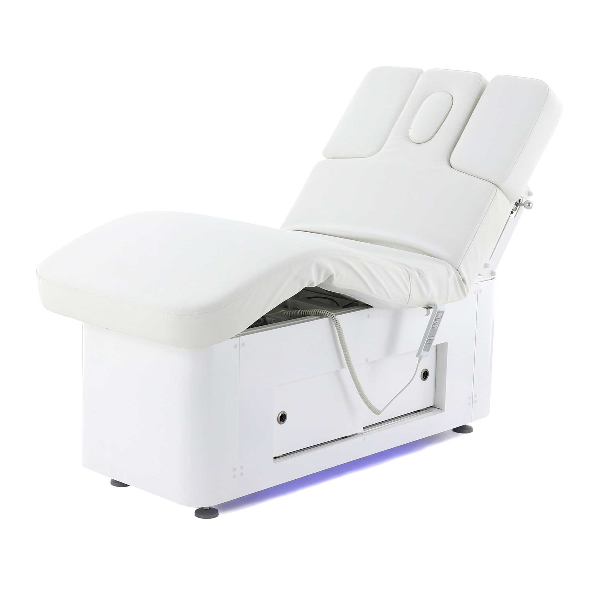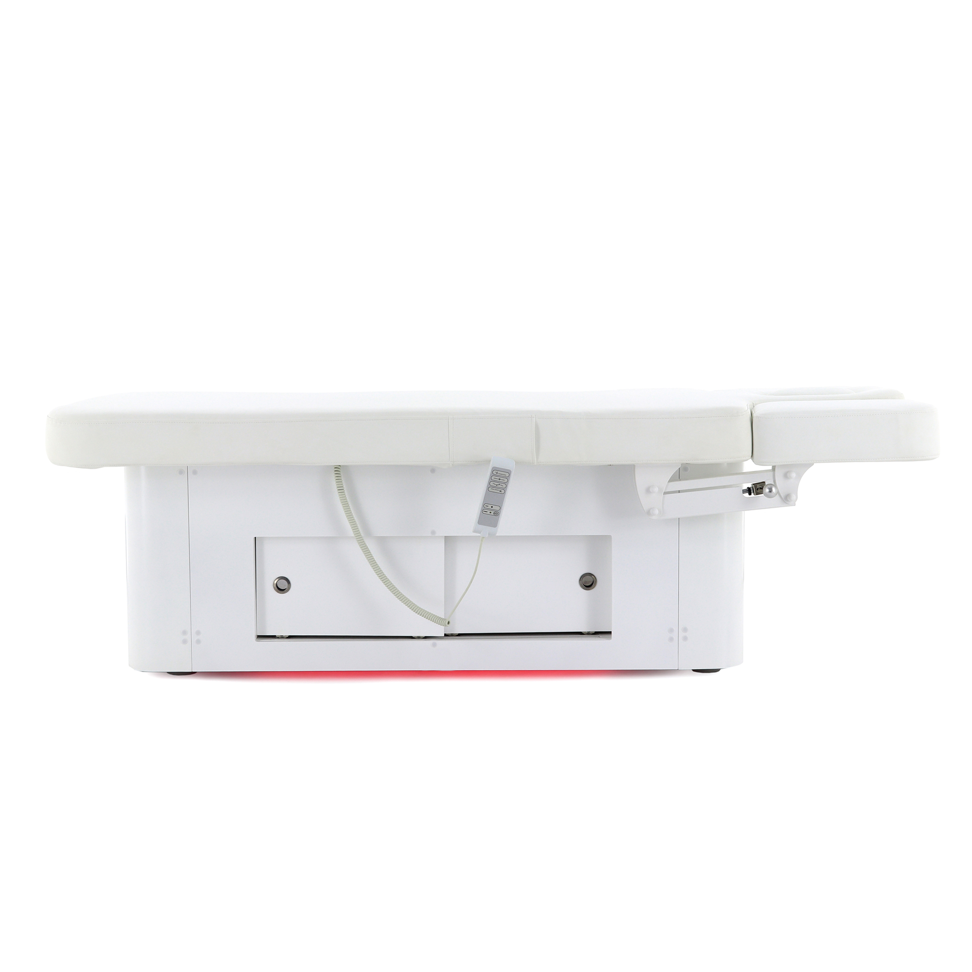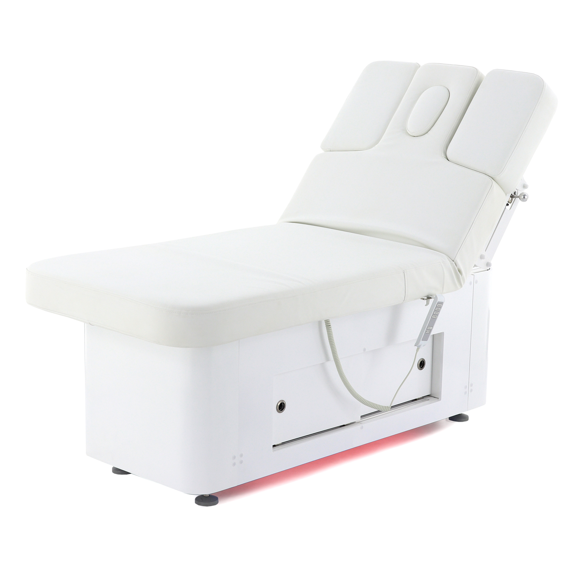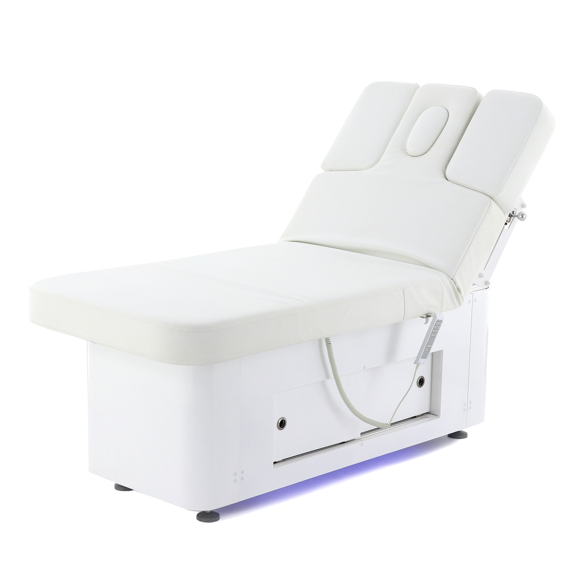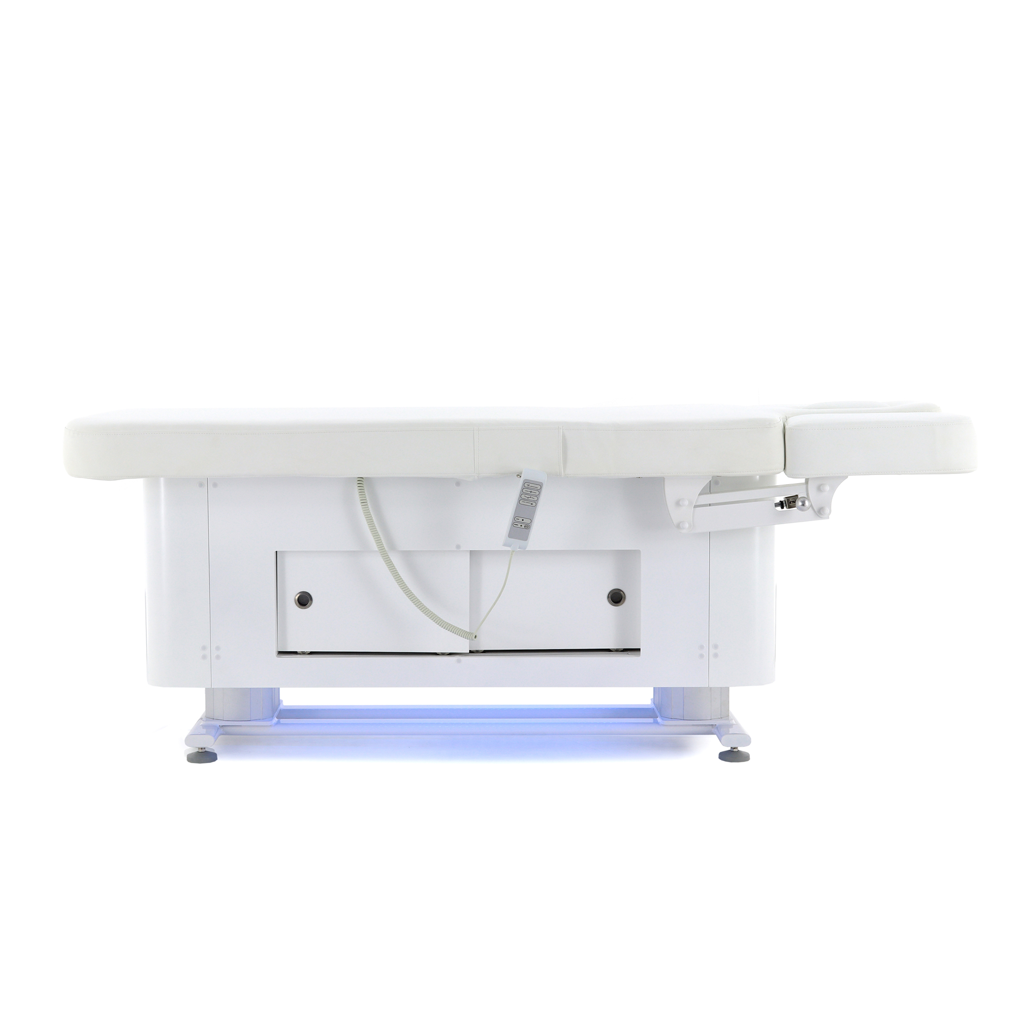 Основание стола оборудовано регулируемыми ножками для компенсации неровностей пола, что обеспечивает стабильность и безопасность во время процедур. Для удобства управления функционалом стола в комплект входят два пульта: проводной для основных регулировок и беспроводной для управления режимами декоративной подсветки.