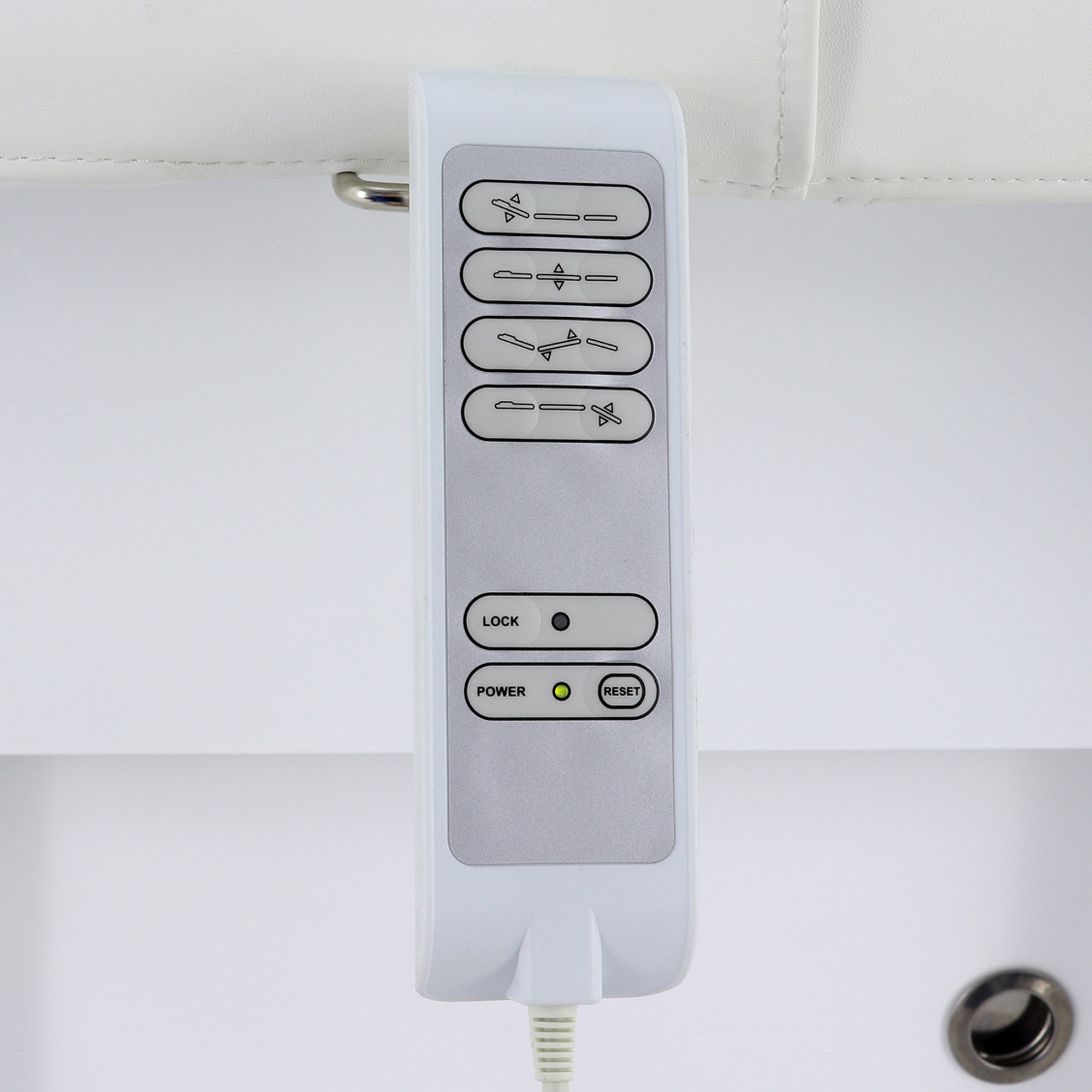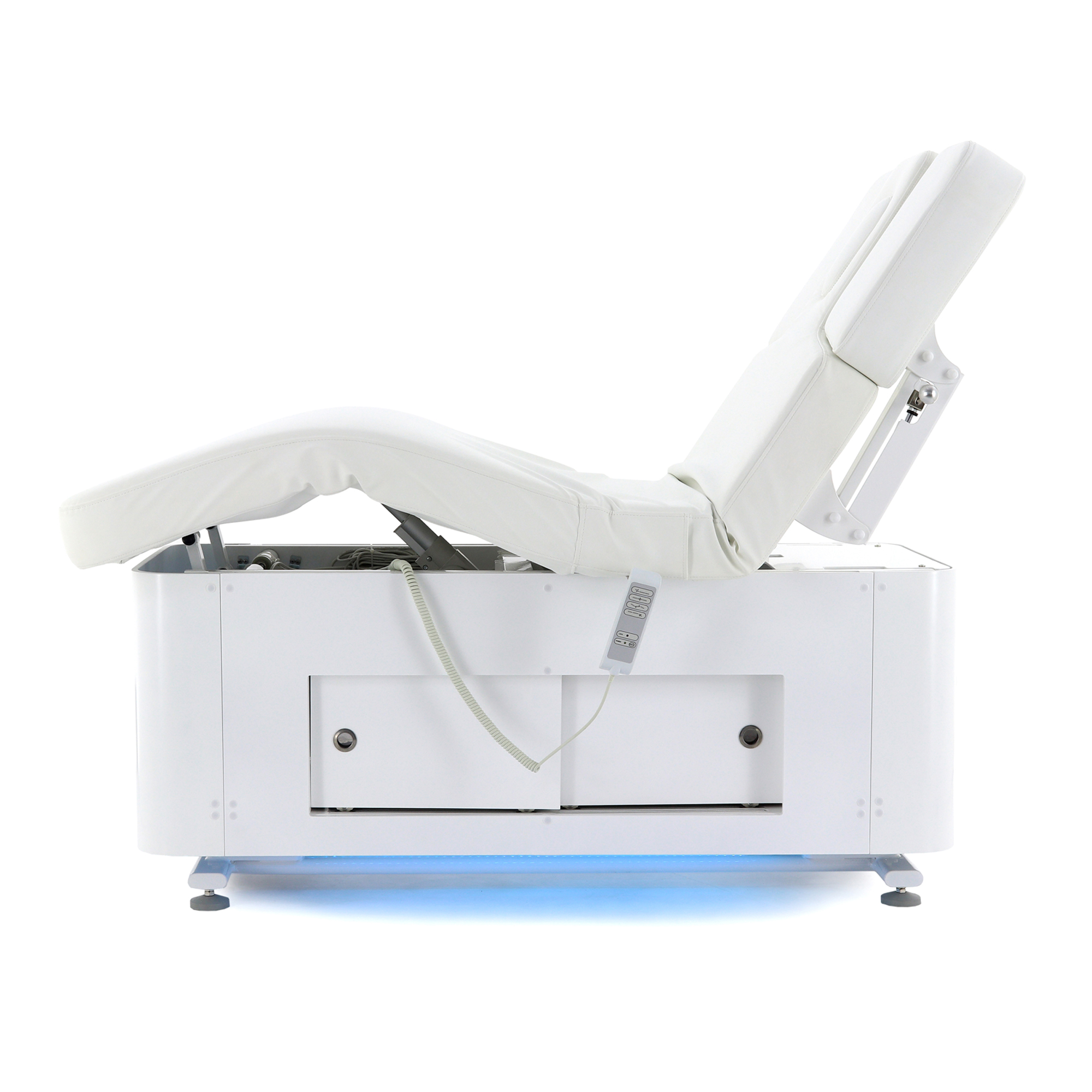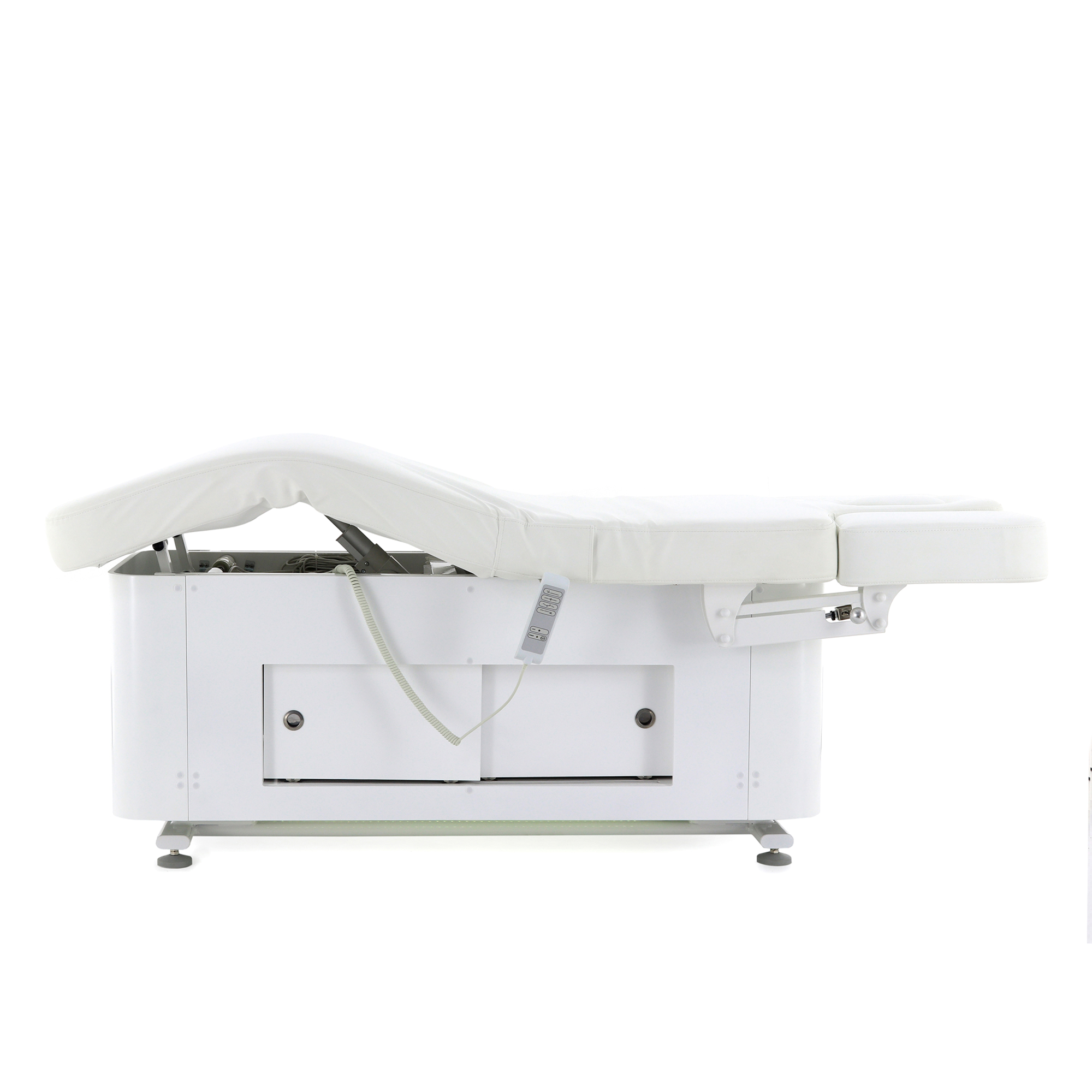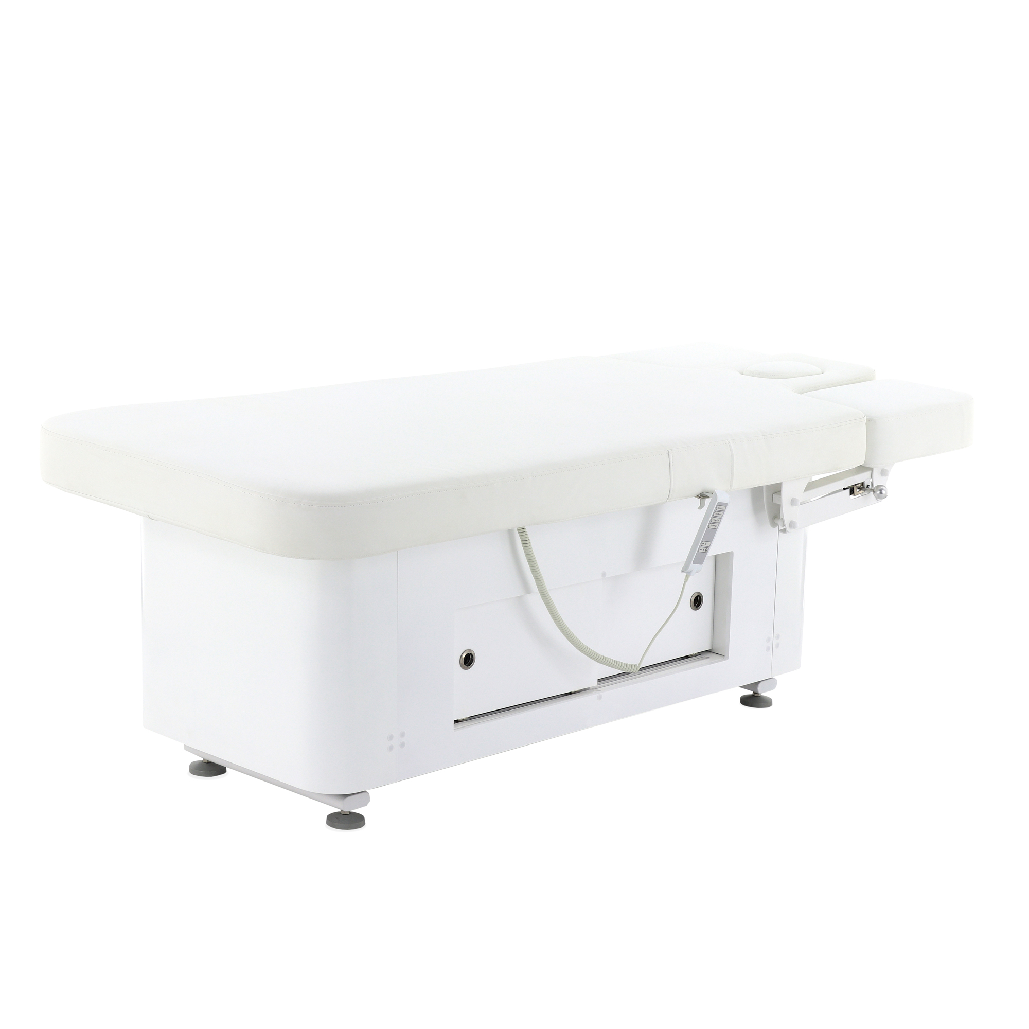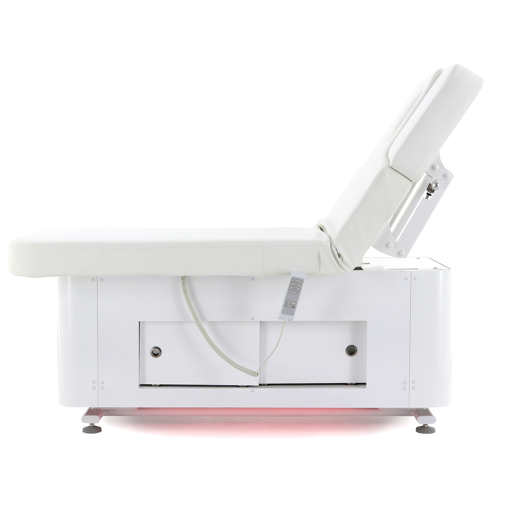 Основание стола оборудовано регулируемыми ножками для компенсации неровностей пола, что обеспечивает стабильность и безопасность во время процедур. Для удобства управления функционалом стола в комплект входят два пульта: проводной для основных регулировок и беспроводной для управления режимами декоративной подсветки.