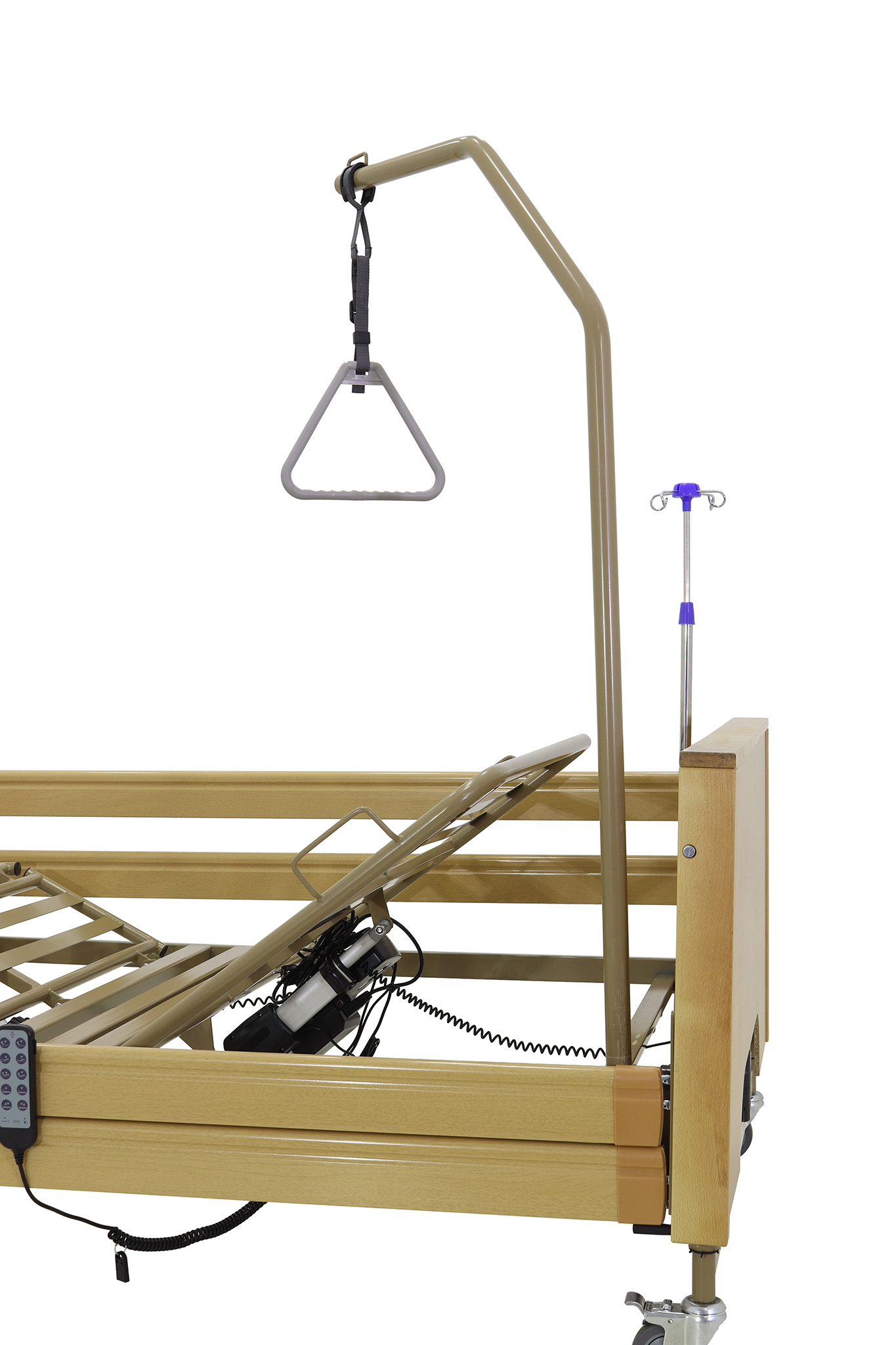 В комплект входят важные аксессуары, такие как дуга для подтягивания и трансфузионная стойка, создающие оптимальное функциональное пространство для пациента и удобство для медицинского персонала. Кровать легко перемещается благодаря колесикам, что облегчает транспортировку внутри отделения. Боковые ограждения выполнены из алюминия, обеспечивая безопасность и долговечность.