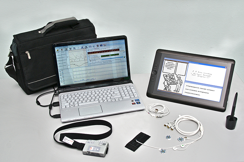 - Базовое устройство сенсорного графического ввода: графический сенсорный монитор-планшет. Он регистрирует ответы испытуемого (рисунки, слова, знаки) синхронно с моторикой руки (траектория, нажим на перо), служит для предъявления инструкций и бланков тестов без использования бумаги, а также позволяет эффективно проводить ряд психофизиологических тестов, выводя интерактивную информацию на экран.