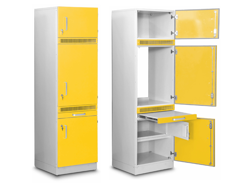 Наружные панели модульной мебели имеют прочную двустенную конструкцию, заполненную звуко- и термоизоляционным материалом, что способствует созданию оптимальных условий для хранения. Двери обеспечивают полное открывание и оснащены силиконовым уплотнителем для плотного прилегания, предотвращая проникновение пыли внутрь. Надежный механизм замка — скрытая ригельная система с трехсторонним запиранием — гарантирует сохранность содержимого.