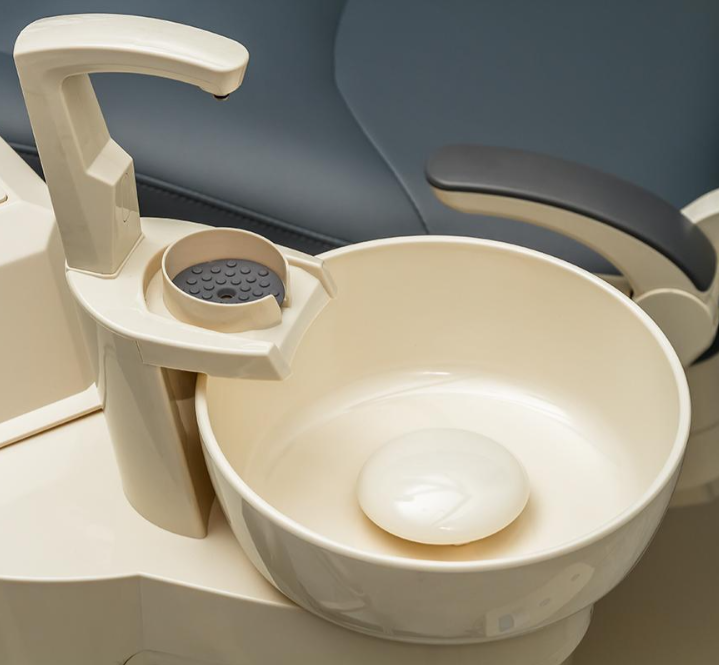 - Съёмная плевательница, поворачивающаяся на 90 градусов, значительно упрощает процесс очистки и дезинфекции, повышая гигиеничность рабочего места.