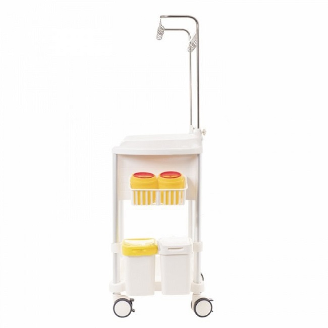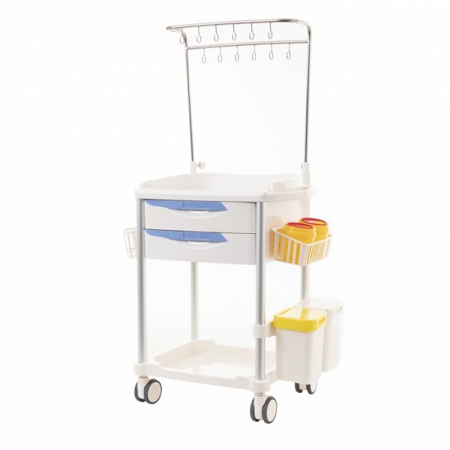 Особое внимание уделено функциональности и эргономике. Тележка оснащена двумя удобными выдвижными ящиками, снабженными разделительными вставками, что позволяет систематизировать и хранить расходные материалы и медикаменты. Интегрированная стойка из нержавеющей стали с 12 крючками предназначена для размещения растворов, обеспечивая их легкую доступность во время процедур.
