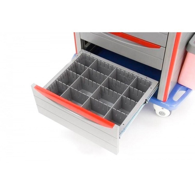 - Продуманная система хранения: Два неглубоких ящика идеально подходят для хранения фарм-препаратов, а два больших ящика и объемный нижний ящик на телескопических направляющих предназначены для инструментария и крупного оборудования. Все ящики запираются центральным замком одним ключом, гарантируя сохранность содержимого.