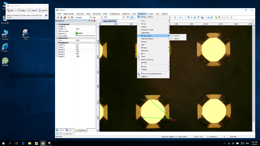 Микроскоп позволяет проводить измерения и документирование различных параметров: размеров деталей, углов, расстояний, а также отклонений формы от заданных шаблонов, что значительно упрощает анализ и контроль.