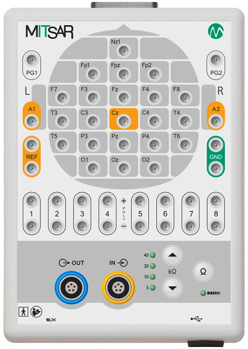 - Удобство мониторинга: Индикация импеданса, расположенная на передней панели, обеспечивает оперативный контроль качества наложения электродов, что минимизирует артефакты и повышает достоверность исследования.